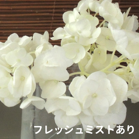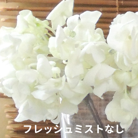 ひと目で分かるほど大きな差が出てきました。スタート時には同じボリュームだったアジサイが、「フレッシュミストなし」はかなり萎んでしまいました。「フレッシュミストあり」はまだ花びらにハリがあります。