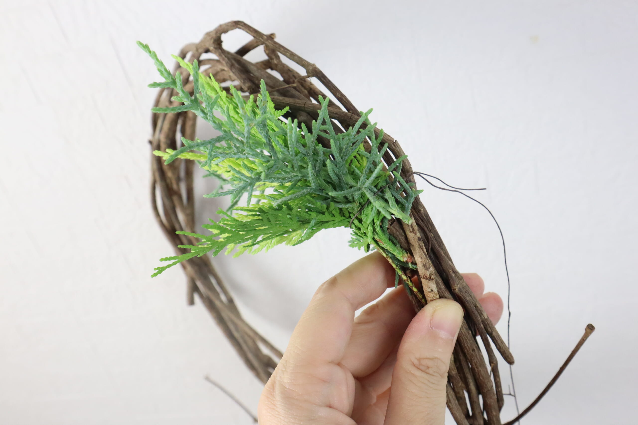 結び目と、枝が出ているリースベースなので、今回は結び目の部分を見せるために一度巻き付けを終了します。
