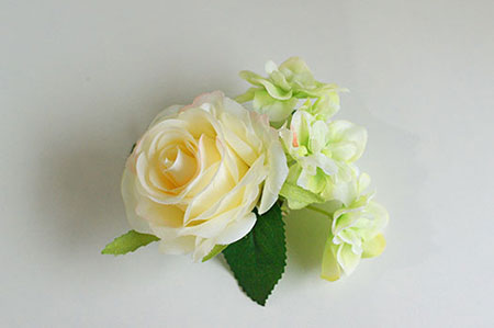 白い大小のバラ、黄緑色のアジサイ、ホップ、サイカス、バラの葉とクリップピンです。