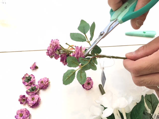 花を強く押す可能性を考えて、花材は壊れにくいアーティフィシャルフラワーをチョイス。