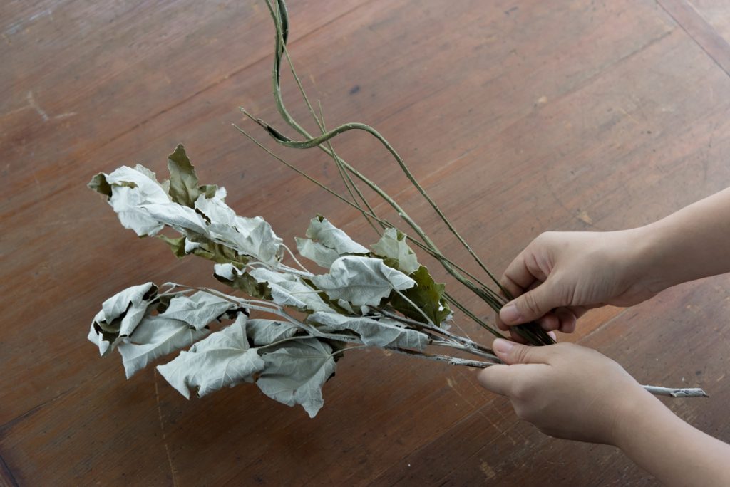 長く切ったイシドロと石化エニシダを束ねます。この二種類が一番大きな植物なので、スワッグの後ろの部分に入ります。