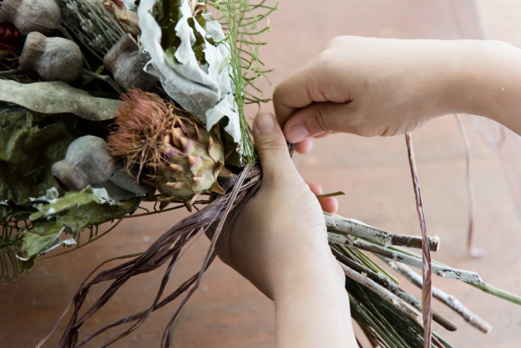 このスワッグを作るときに使う材料は、飾りにするドライフラワーと植物を束ねるヒモのみ。シンプルな材料でもバランスがよく、見ごたえのあるドライフラワーのスワッグを作る方法をご紹介します。