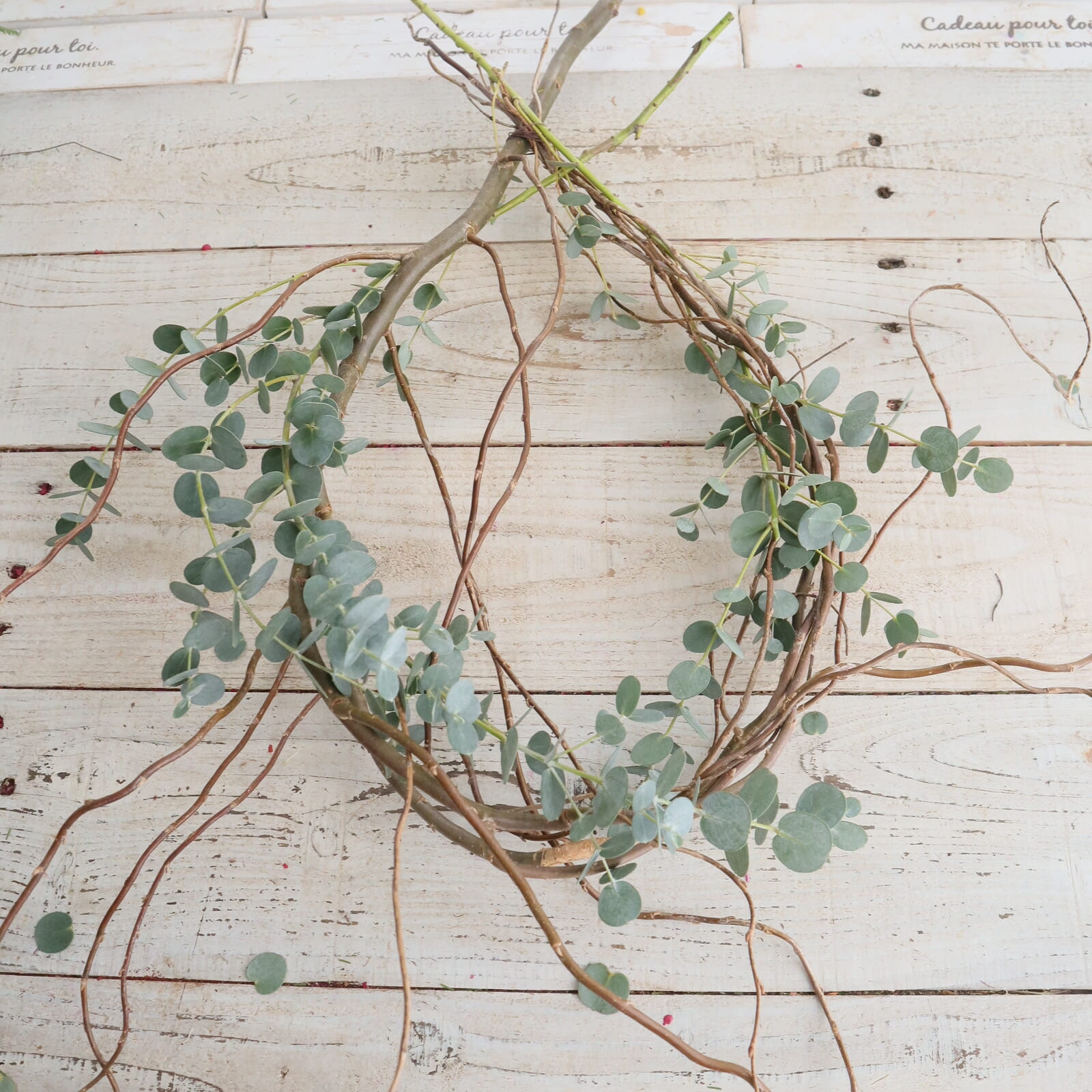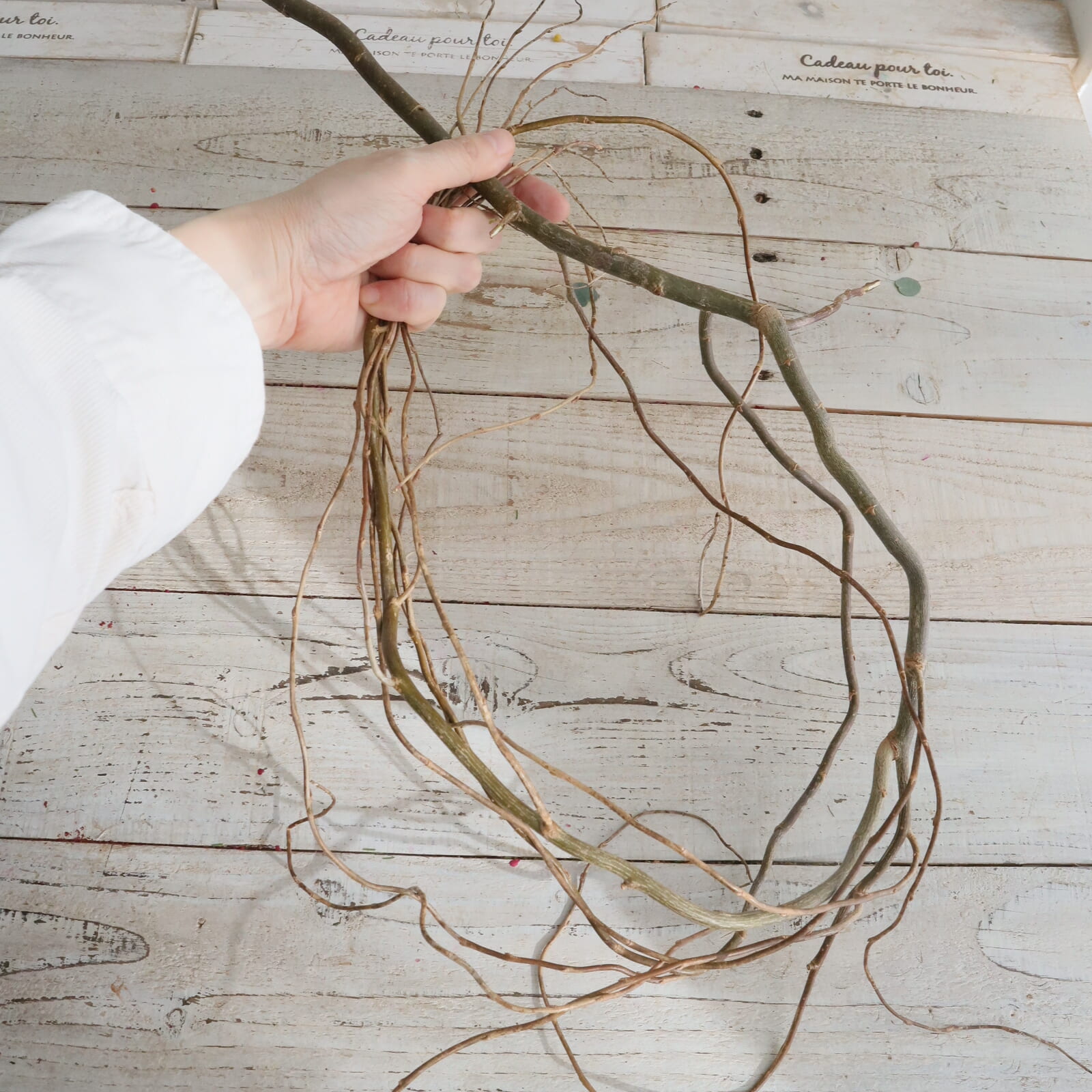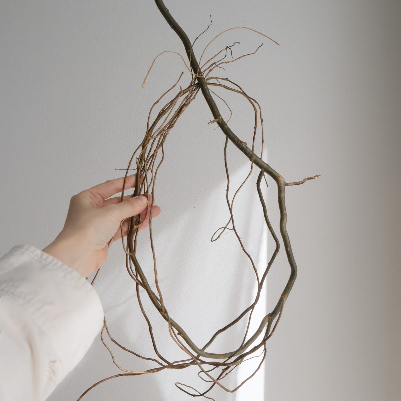 ヤナギの脇枝、そのままでもいいですがゆるく全体に巻き付けてもナチュラルな仕上がりになります。