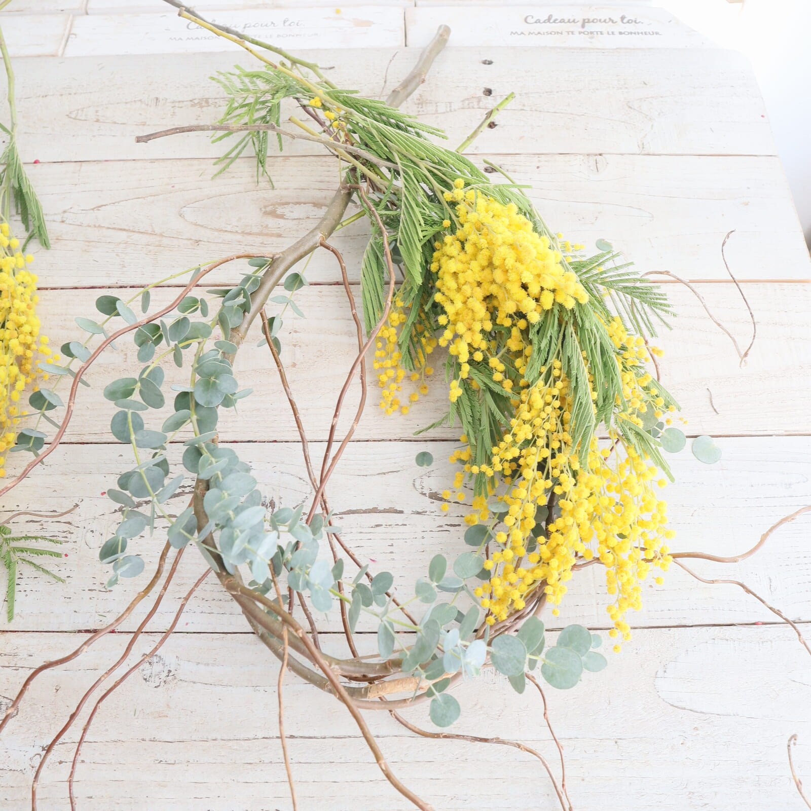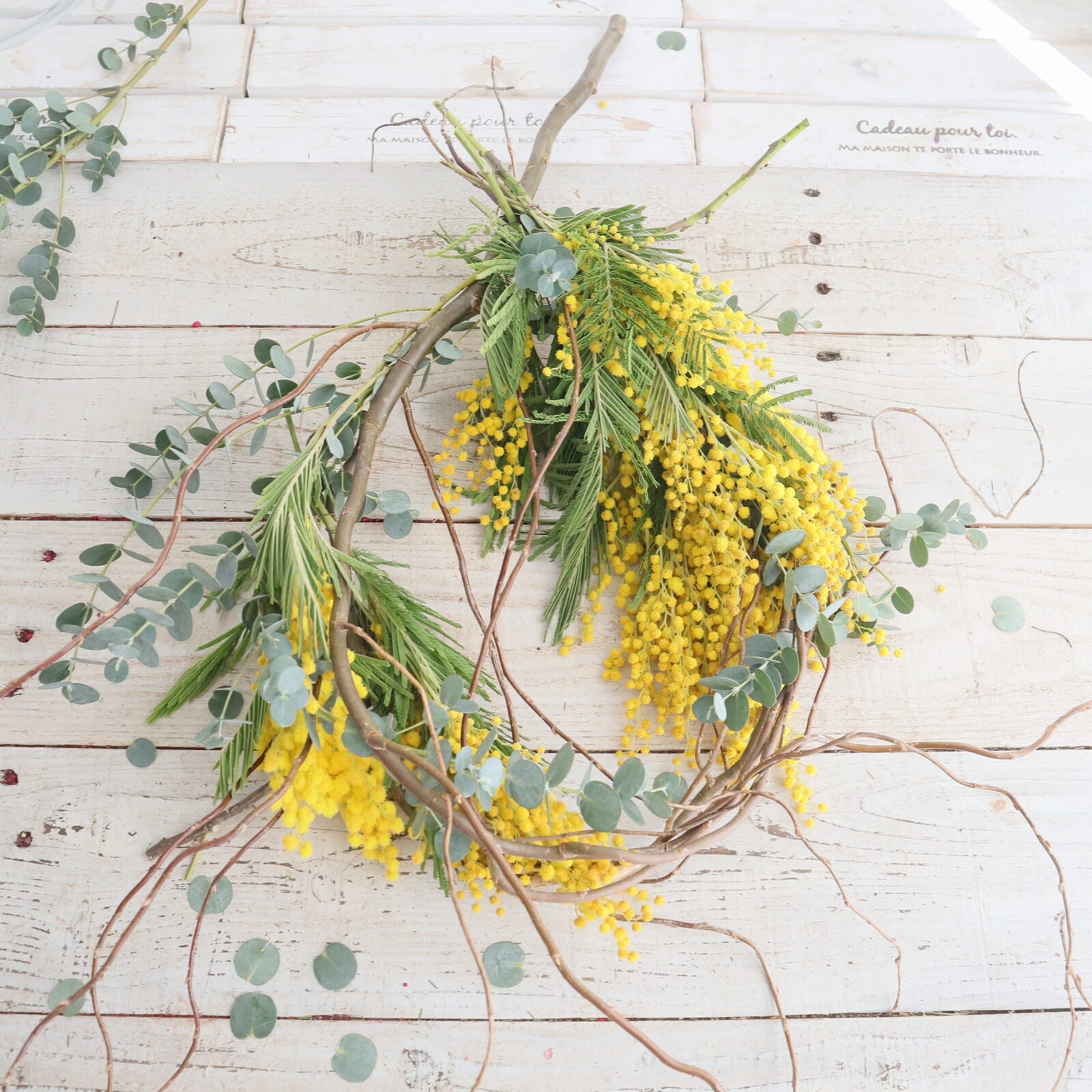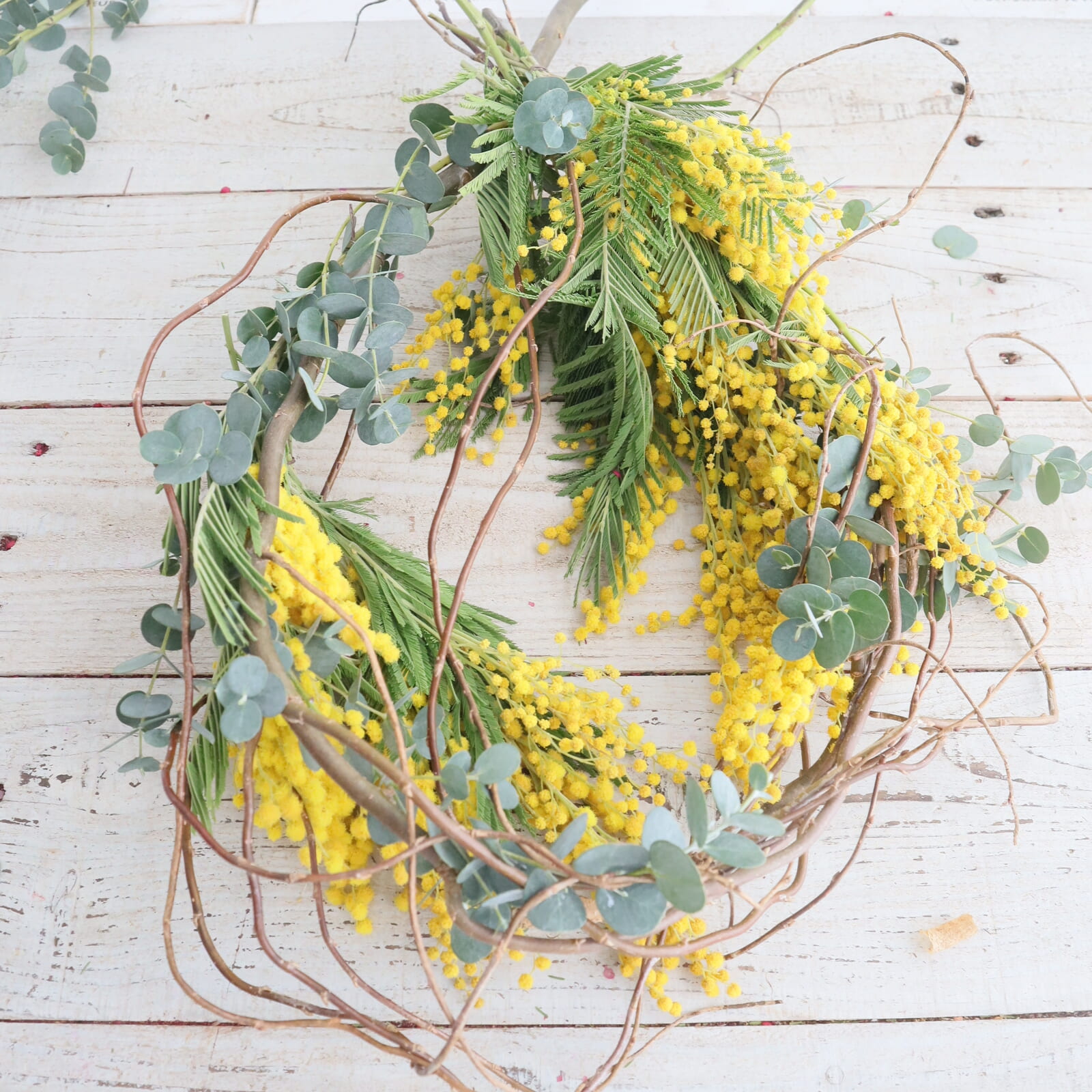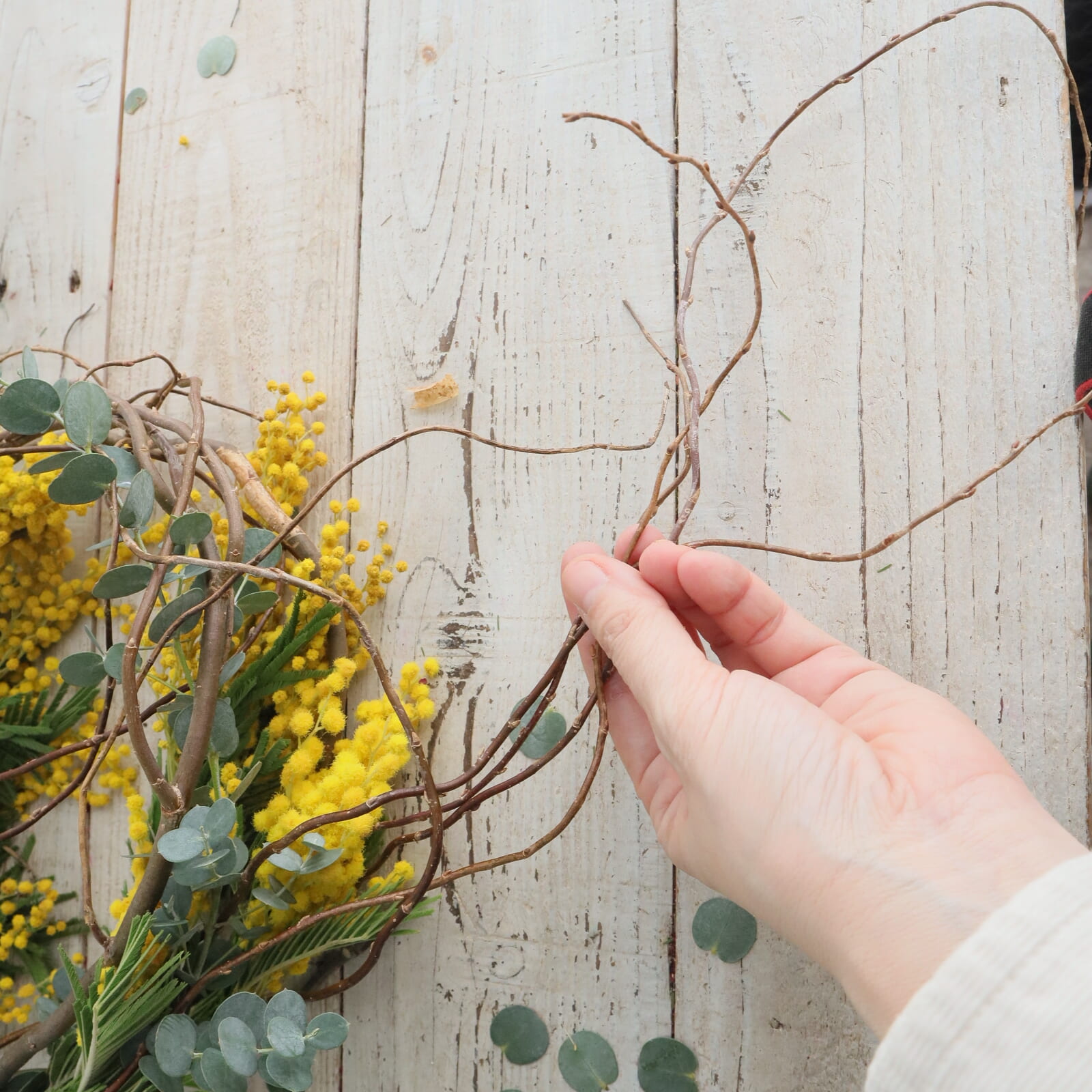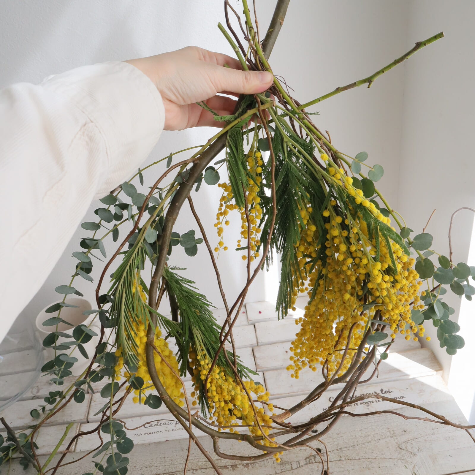 ミモザの配置を決めます。仮置きして好きな配置に決めます。ミモザは枝ぶりが色々だと思います。切り分けてもいいし、小枝にまとめても。
