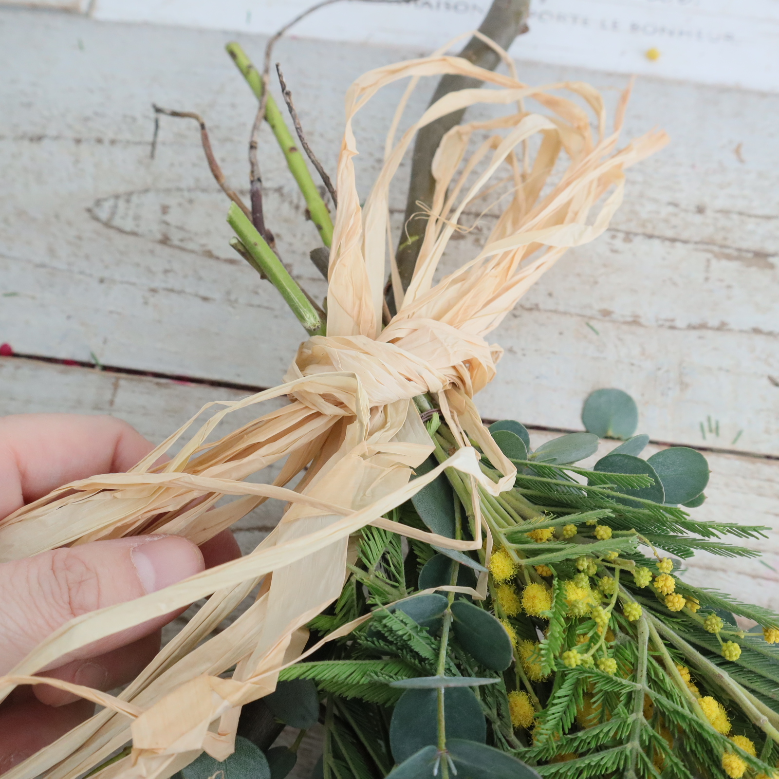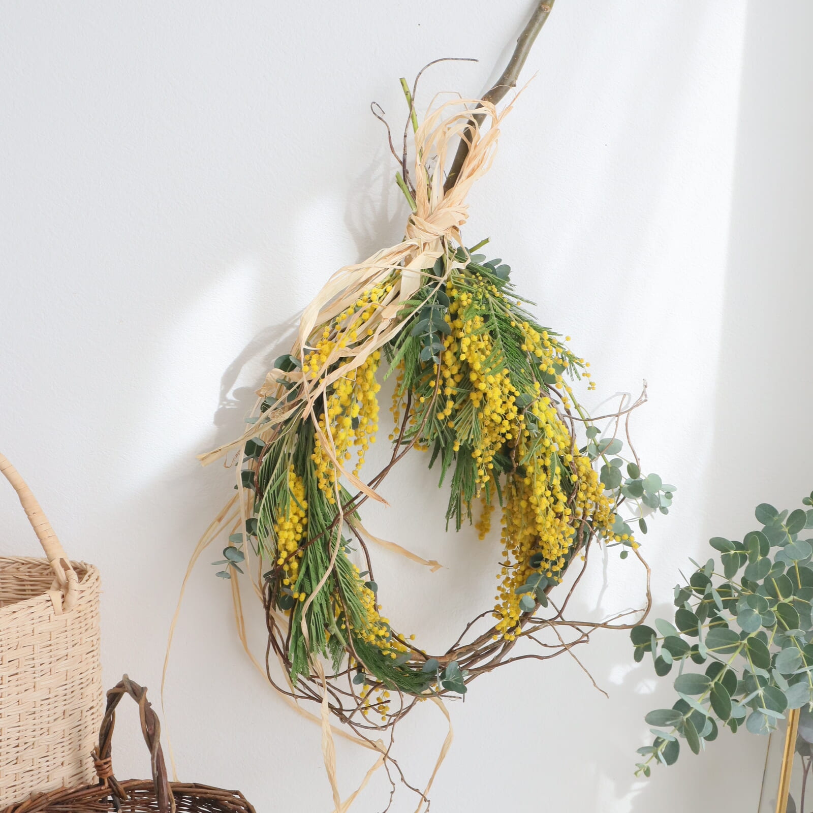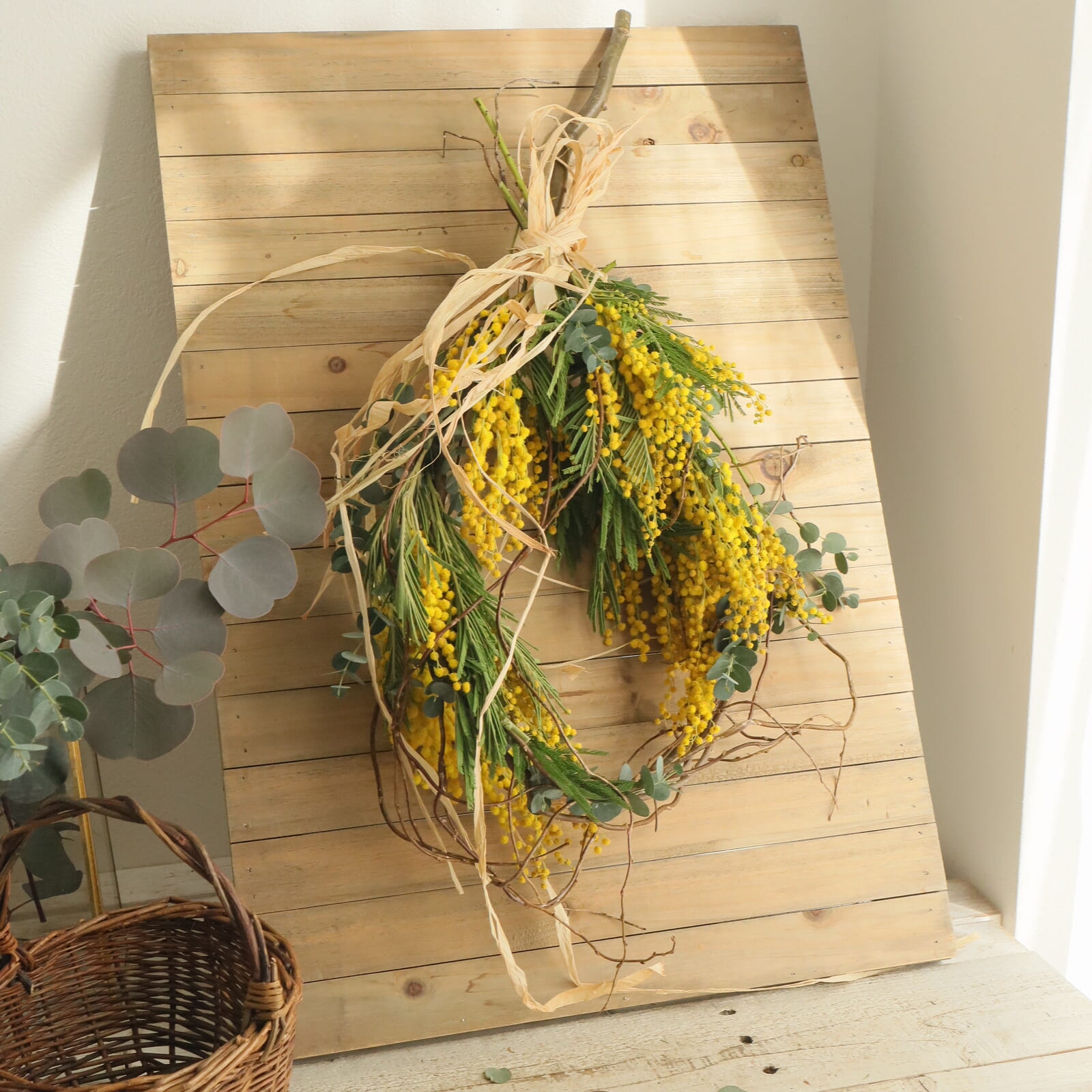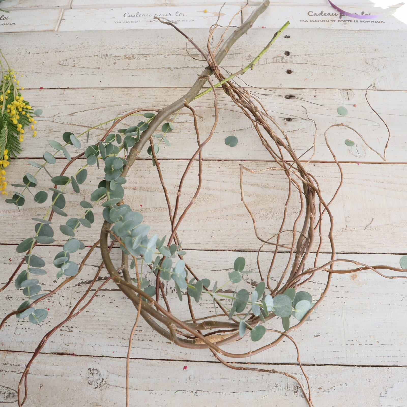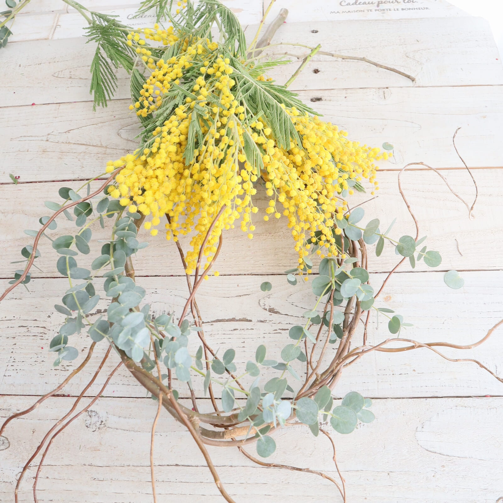 ミモザの配置を決めます。仮置きして好きな配置に決めます。ミモザは枝ぶりが色々だと思います。切り分けてもいいし、小枝にまとめても。