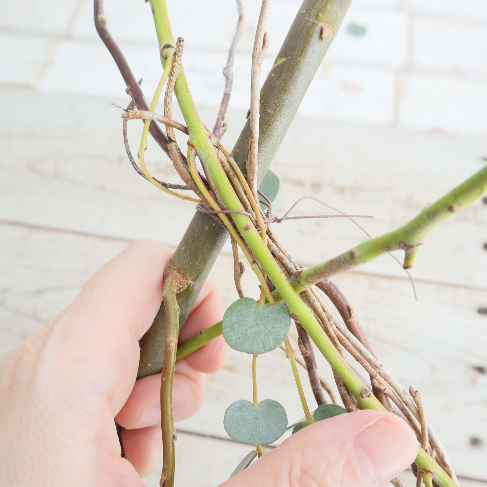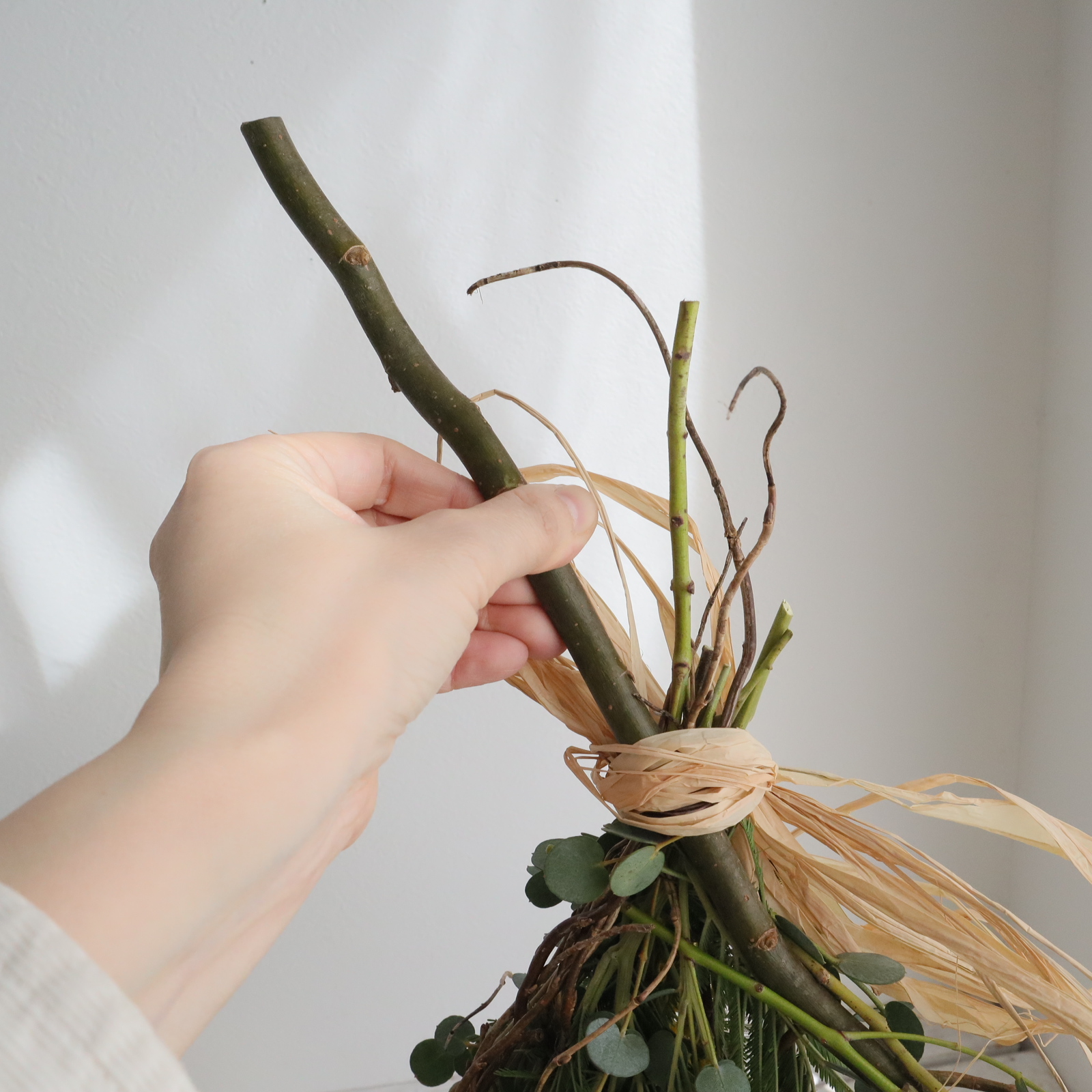 配置を決めたら、ワイヤーでミモザをヤナギの枝に固定します。
