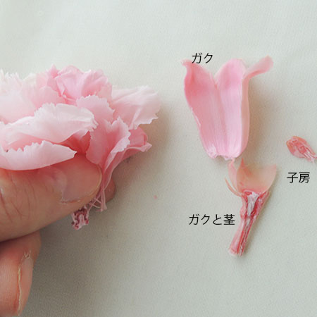 ガク・茎・子房を取り除き、花びらの束を作ります。生花の場合はシベもとりますが、プリザーブドはほとんどわからなくなっているので邪魔になる固まり部分(子房)のみ取り除けばOKです。