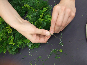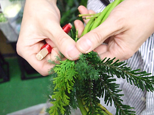 先ほどのリースベースに葉を巻きつけていきます。近「今回はわかりやすいように赤のワイヤを使いますね~。
