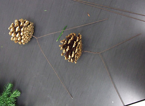 松かさにはワイヤの真ん中をあて、かさにひっかけてクロス。