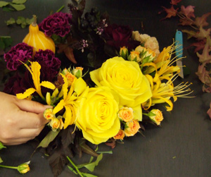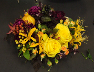 黄色のラティナと紫の花材との間にオレンジの小花達を入れ、コントラストを少し和らげます。