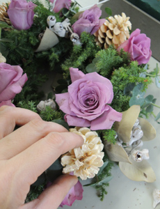 松かさ。ぬり枝。ガラスボールを飾ります。濱「キラキラしてきれいな松かさですね。」