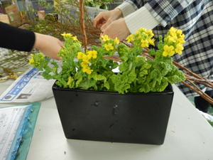 濱「菜の花~春ですね。」近「花器を黒にして、あまり野の感じがでないデザインにしたいと思います。」