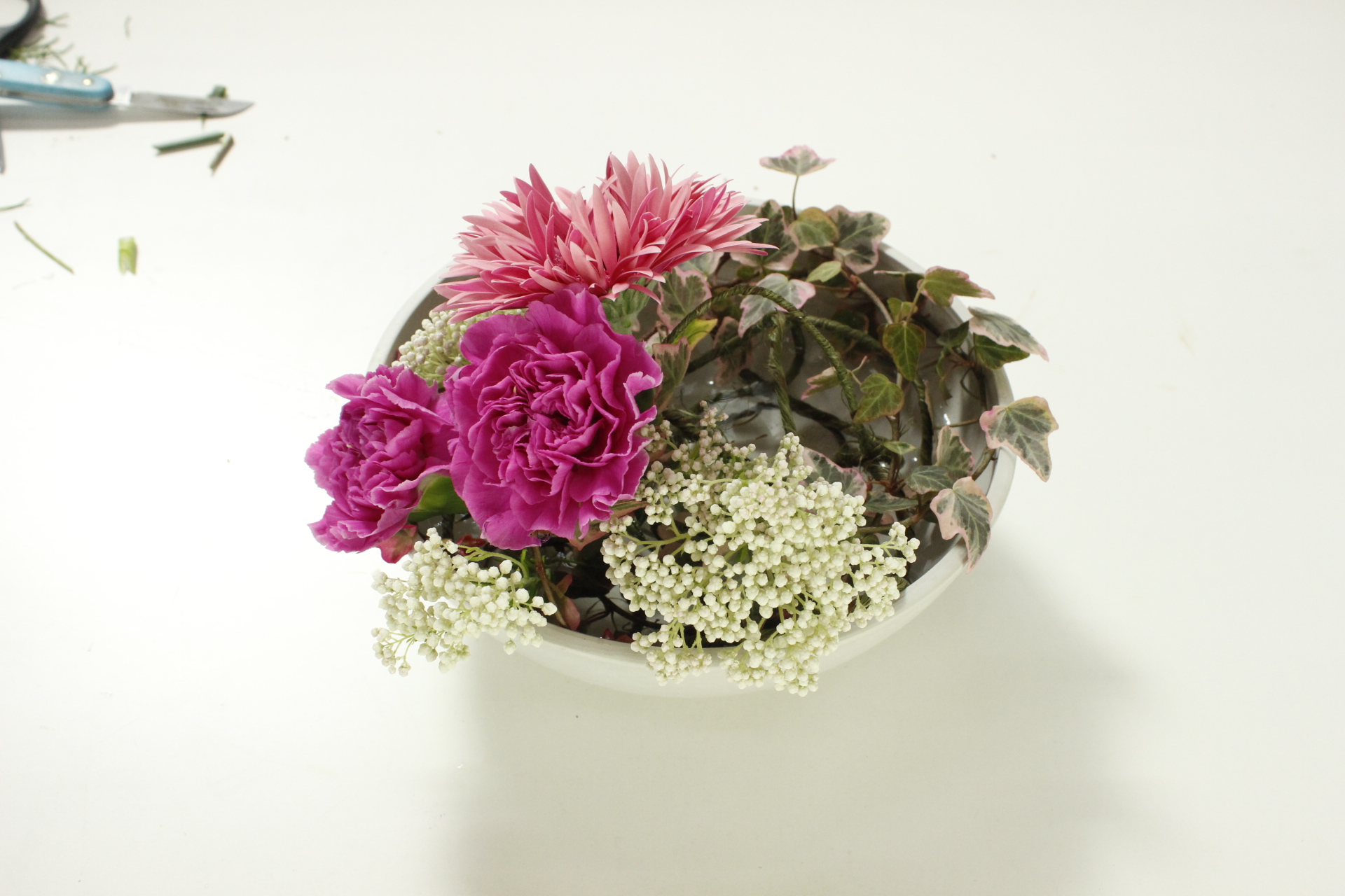 近藤先生「花とライスフラワーを交互に入れていくと花が固定しやすくなります。」