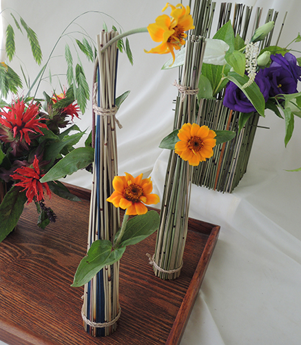 ②③の花器では、パンリードを花留めにしてみました。花器の上に横たわるようにパンリードをのせるだけです。