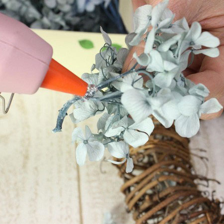 アジサイにグルーガンをつけたらリースに挿していきます。
