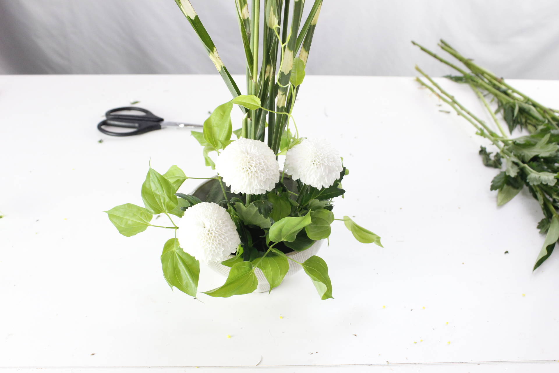 近藤先生「お団子代わりのピンポンマムを入れます。 前に3本、後ろに2本で作ってみます。」