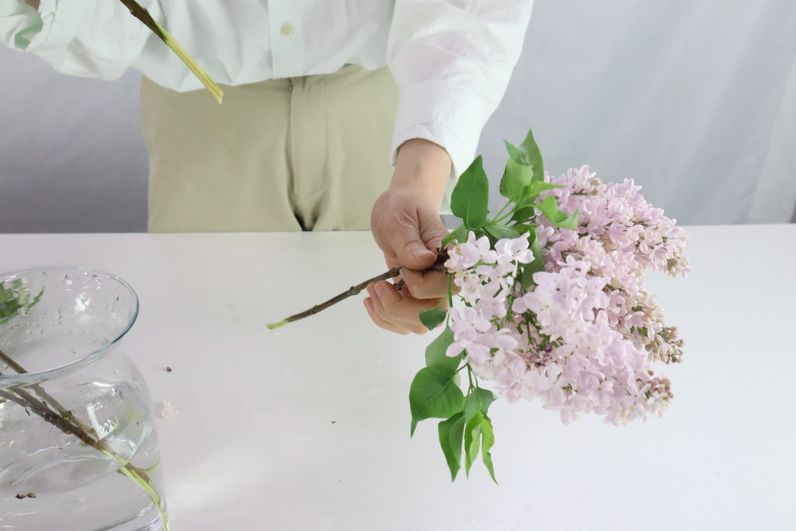 近藤先生「ライラックはしっかり水揚げをしておきましょう。 下がりやすいお花です。」