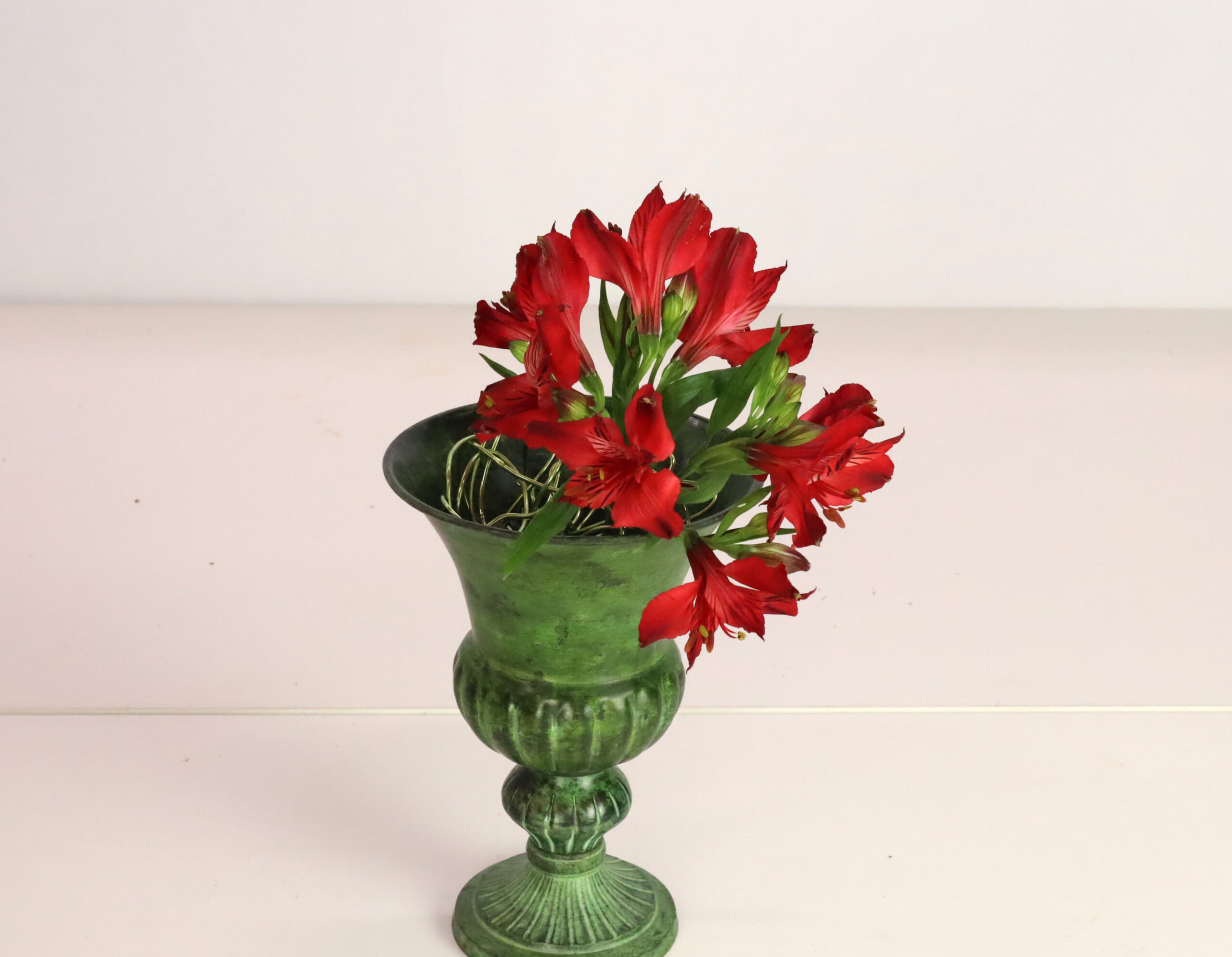 気温が高くなってくると、できるだけ長持ちする花がいいですね。 アンスの赤とグリーンの夏らしい取り合わせです。