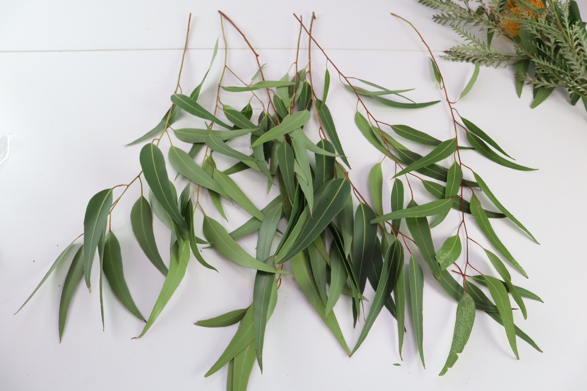 枝分かれがあるユーカリは切り分け、握り部分の葉を取り除きます。