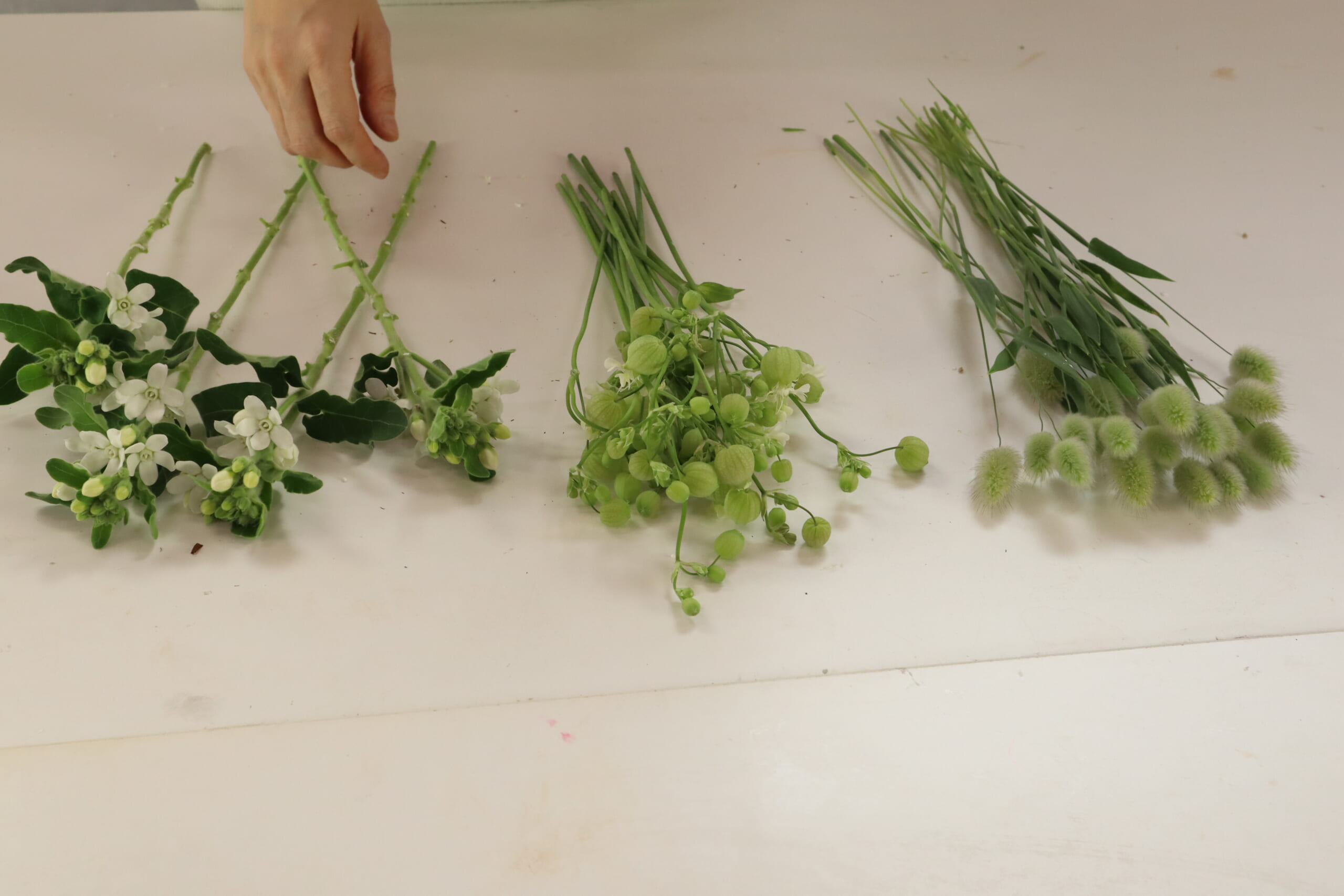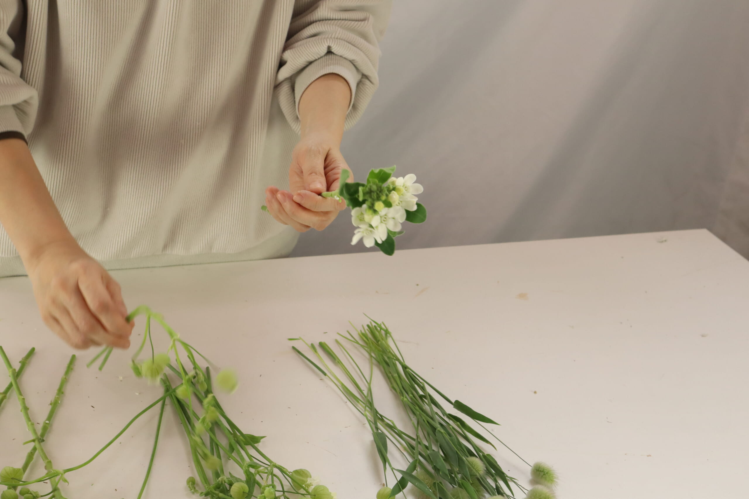 ぎゅっときつく花がそろってしまわないように、花どうしがフワッとなるように整えながら束ねる。