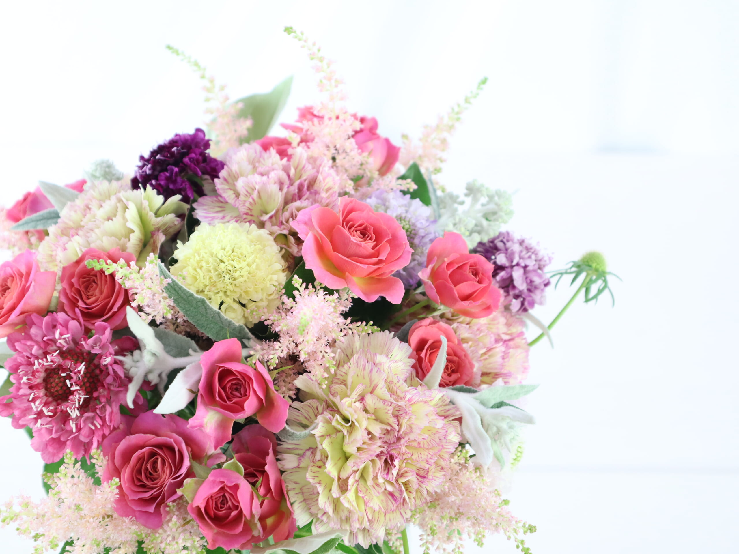 個性的な複色のカーネーションとピンクのスプレーバラや季節のお花を合わせたブーケ/アレンジを作ります。