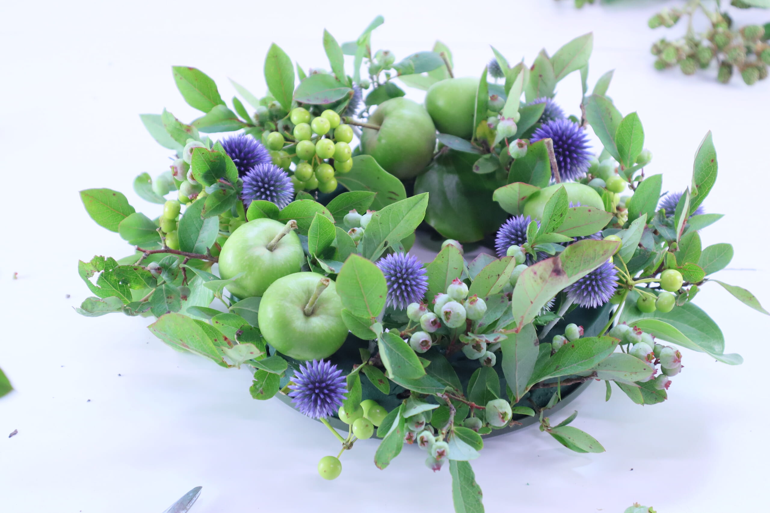 近藤先生「ここでルリタマアザミを入れるときは、青りんごの高さに合わせます。 茎を全部埋めるのではなく、りんごの高さに合わせて茎を途中まで入れます。」