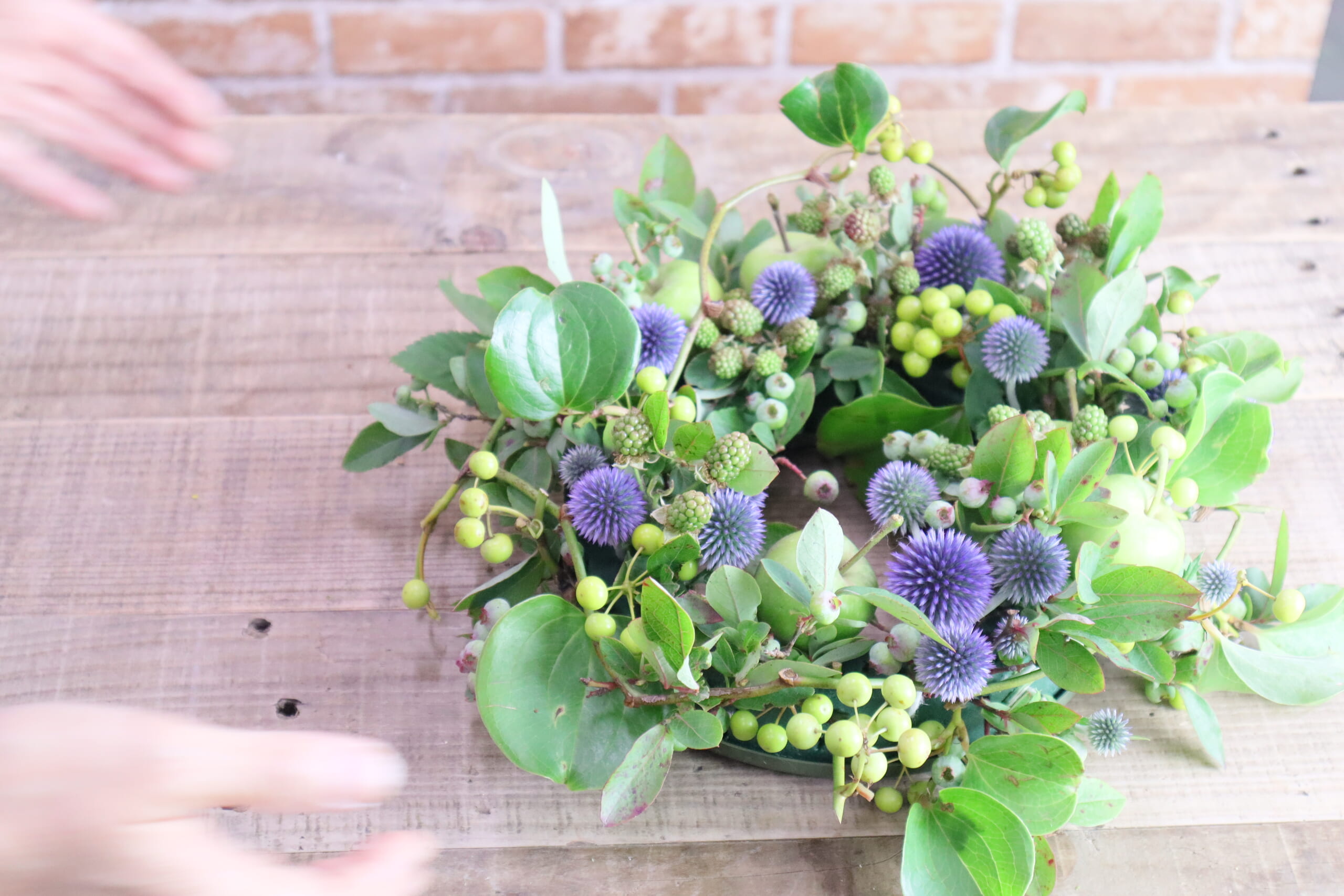 近藤先生「ブラックベリーを入れます。 実物たっぷりのリースになりました。 あとは、全体のバランスを整えましょう。」
