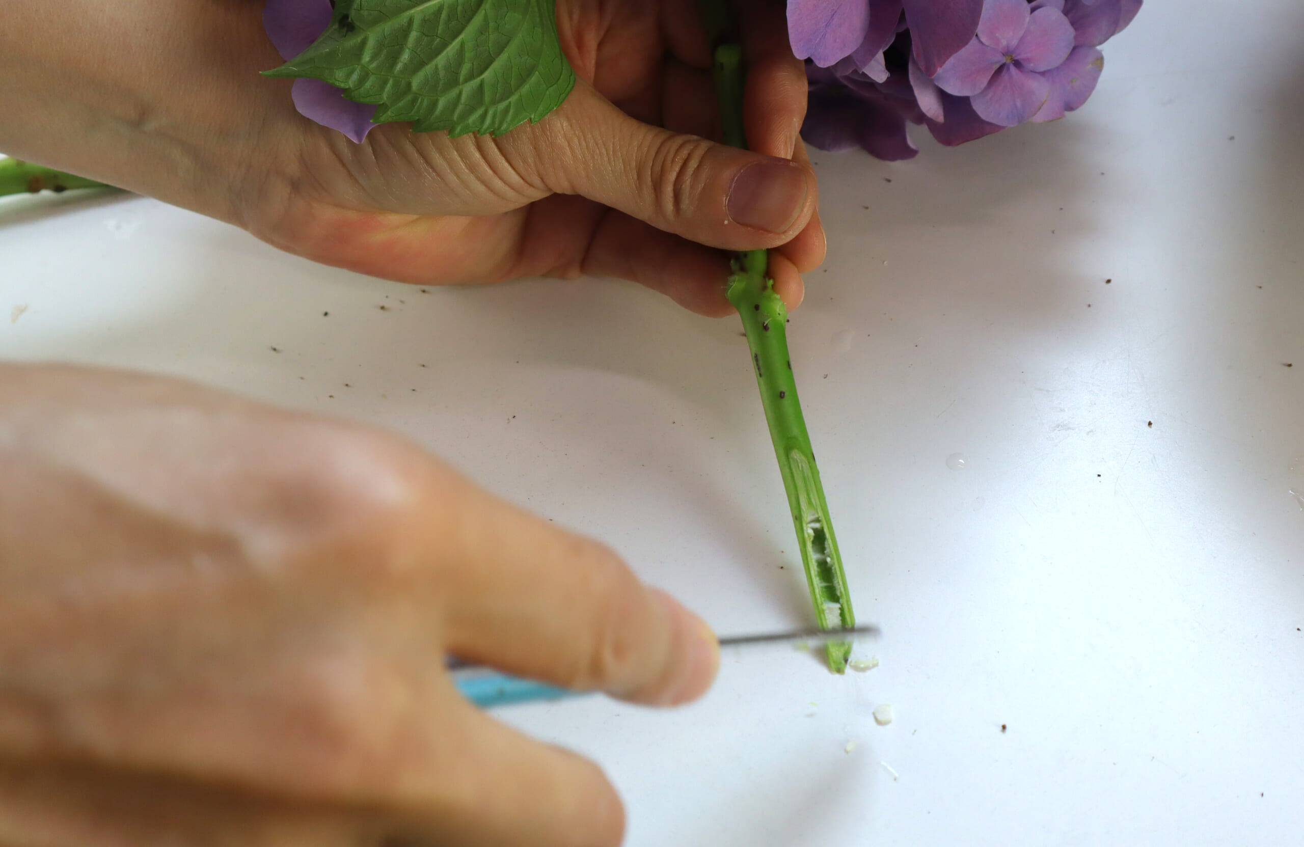 近藤先生「アジサイは低く入れます。 長さを確認して茎は斜めにカットして、ワタを取ります。」
