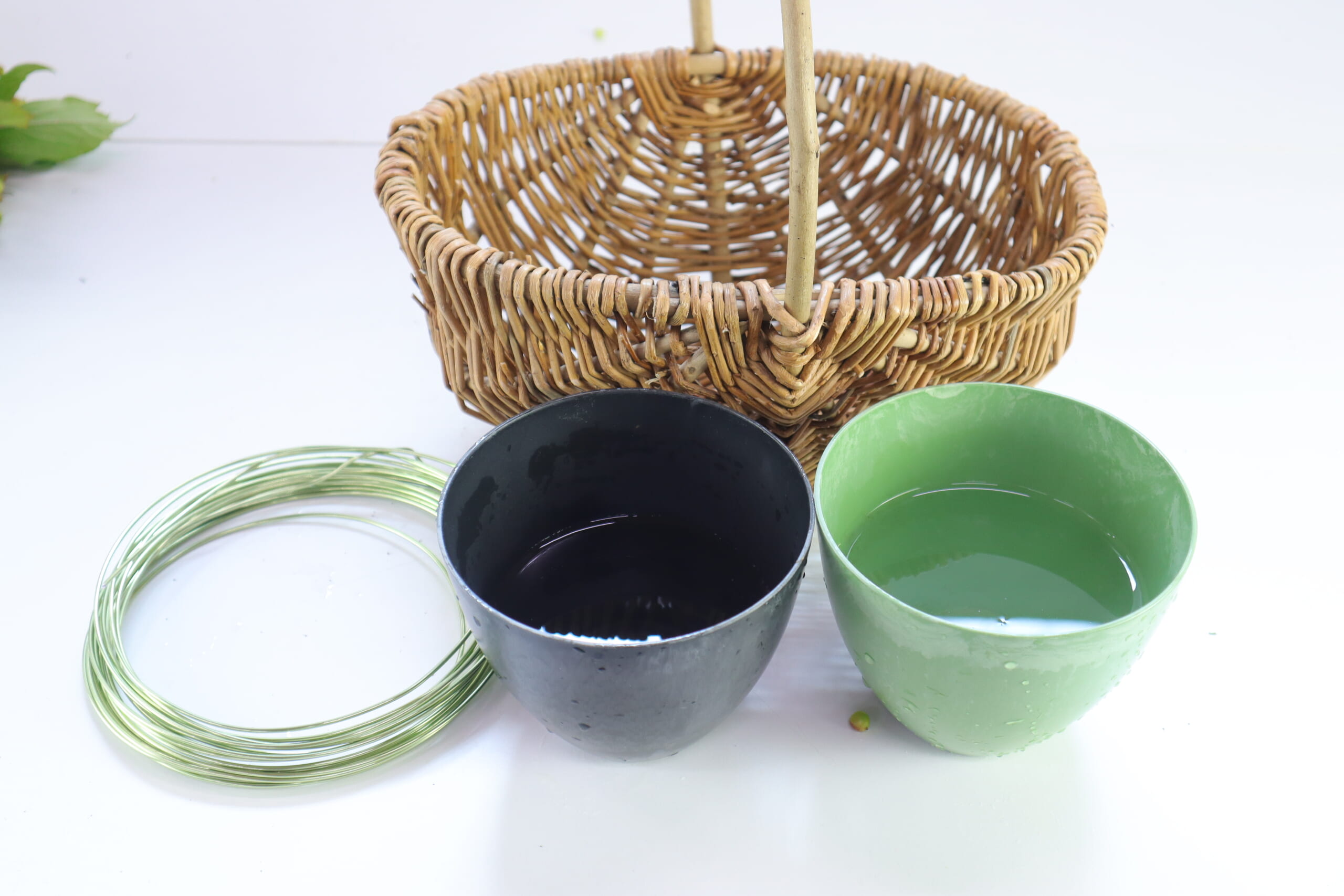 近藤先生「今回大きめなバスケットなので、花器を2つ使います。 アルミワイヤーで花留めにします。」