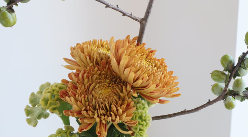 インテリア 作品例 レッスン/『秋のマムと豆柿で投げ入れ』の作り方