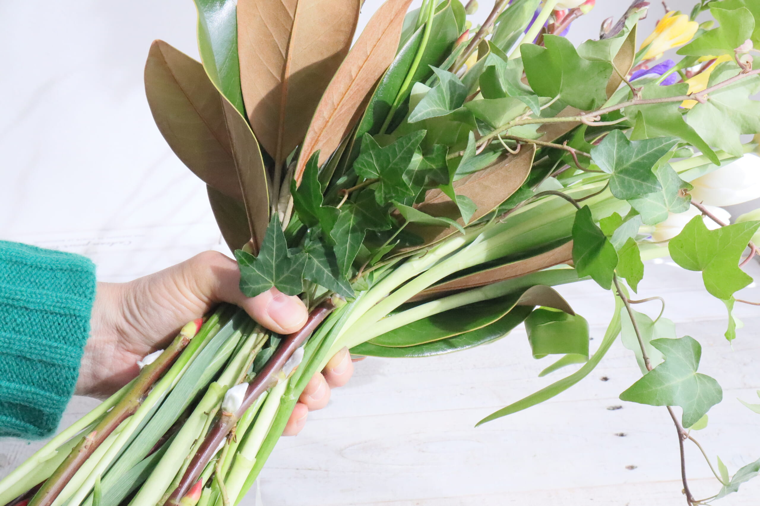 近藤先生「アイビーをまとめて足元に添え、ラフィアで縛ります。 」