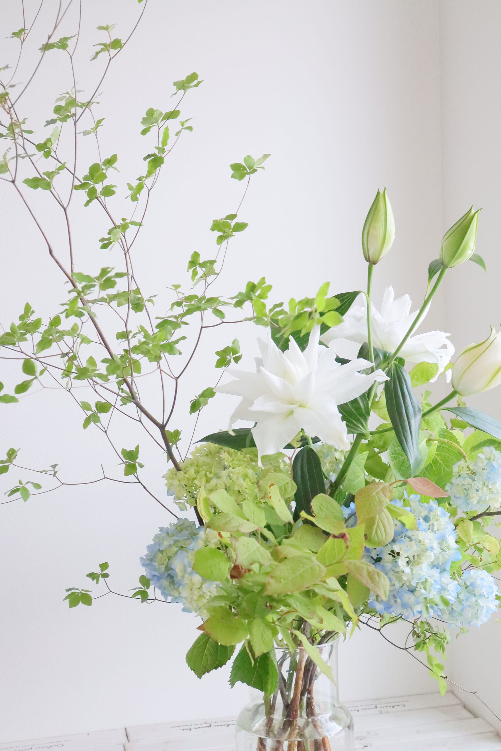 初夏の枝物 ドウダンツツジ・夏ハゼに、アジサイ・ユリと初夏のオールスター花材を一緒に大きくいけましょう。