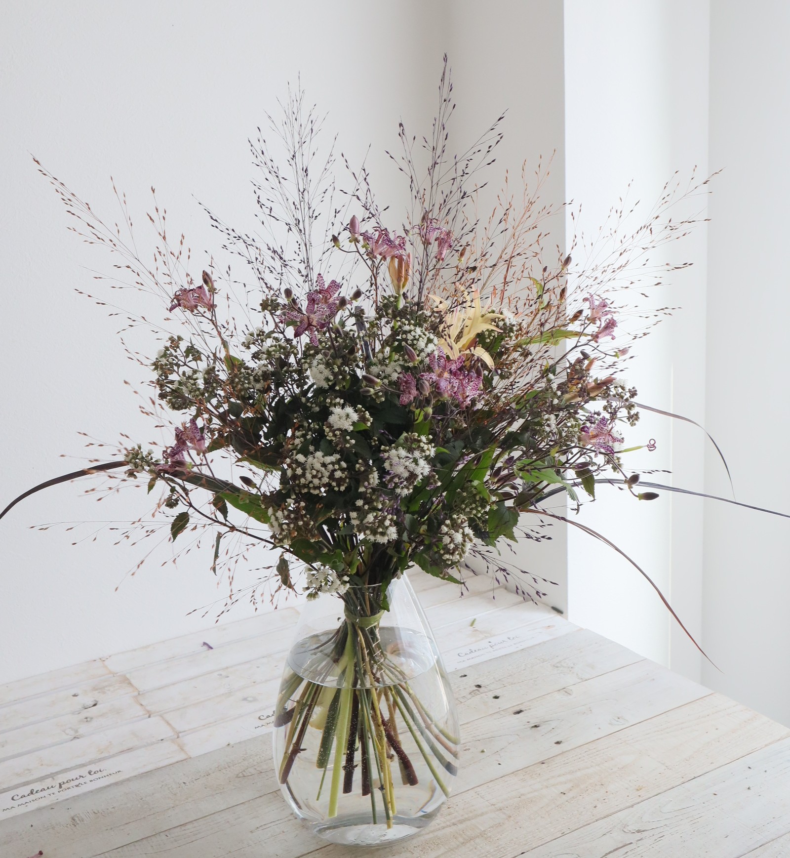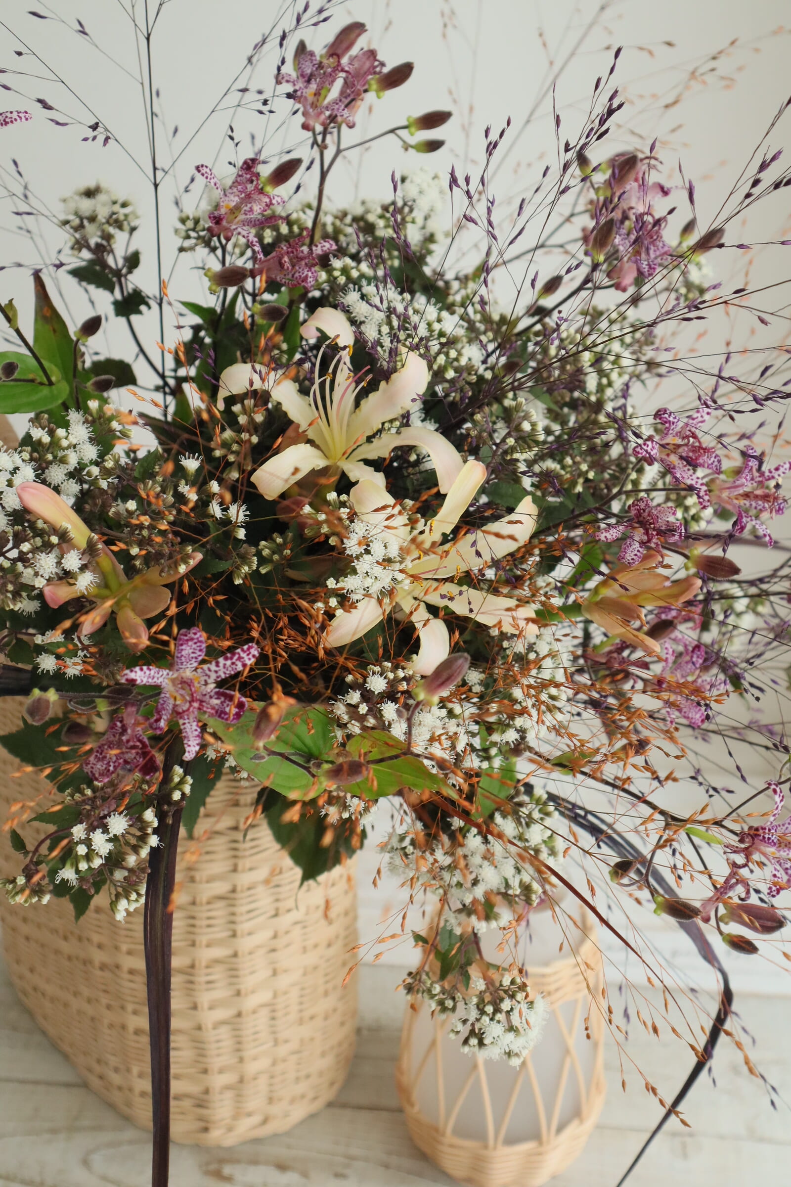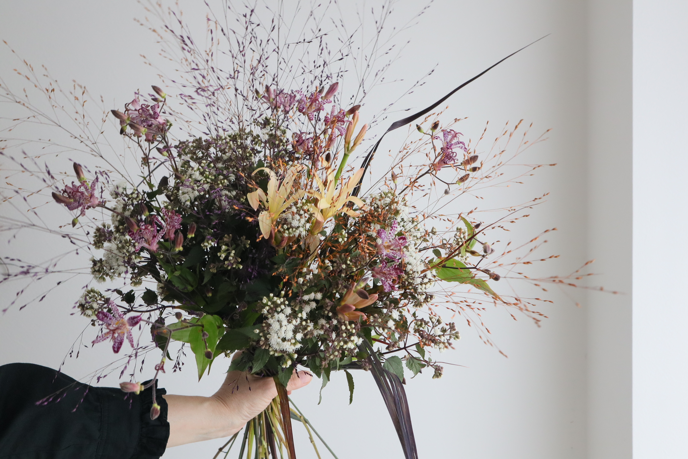 近藤先生「パニカム2色(オレンジ、パープル)と、季節の花でナチュラルな花束にします。今回は、紫とホトトギス。 白いユーパトリューム。 クリーム系のリコリスです。 」