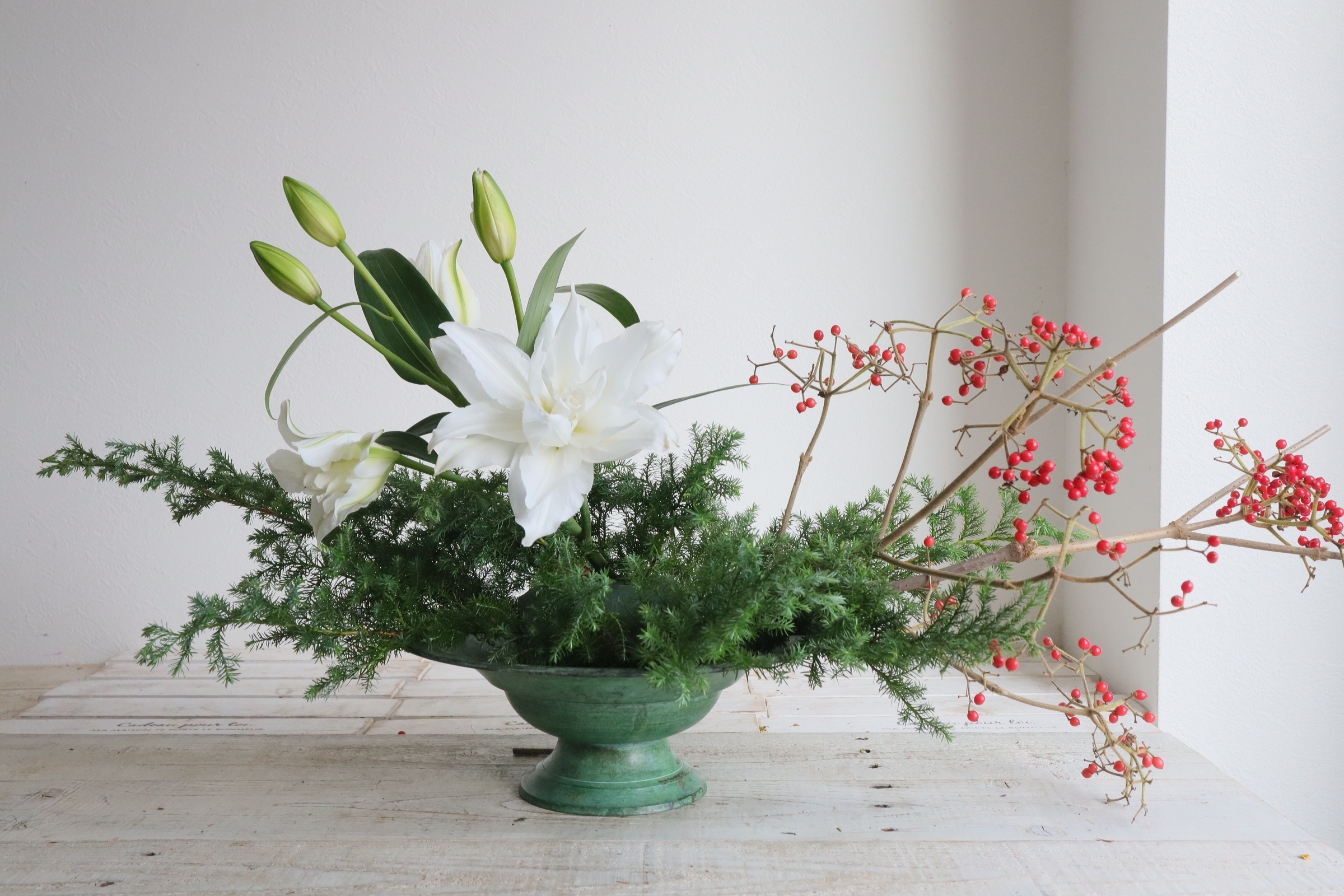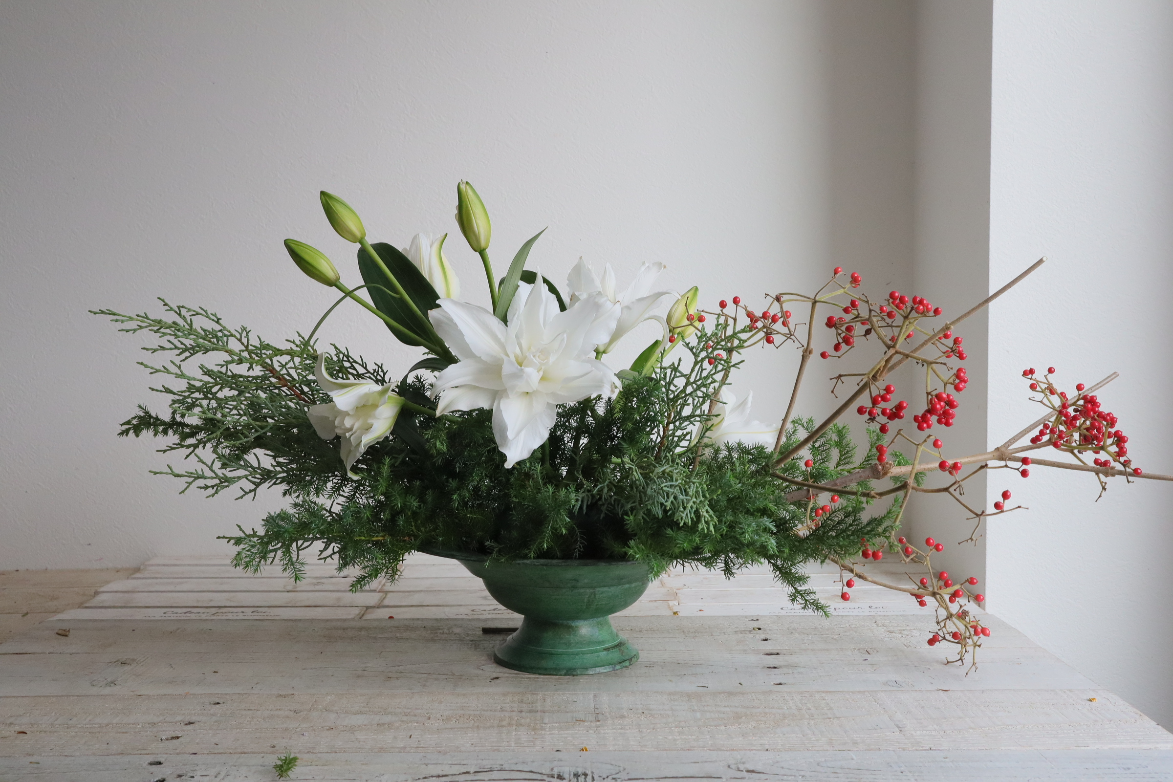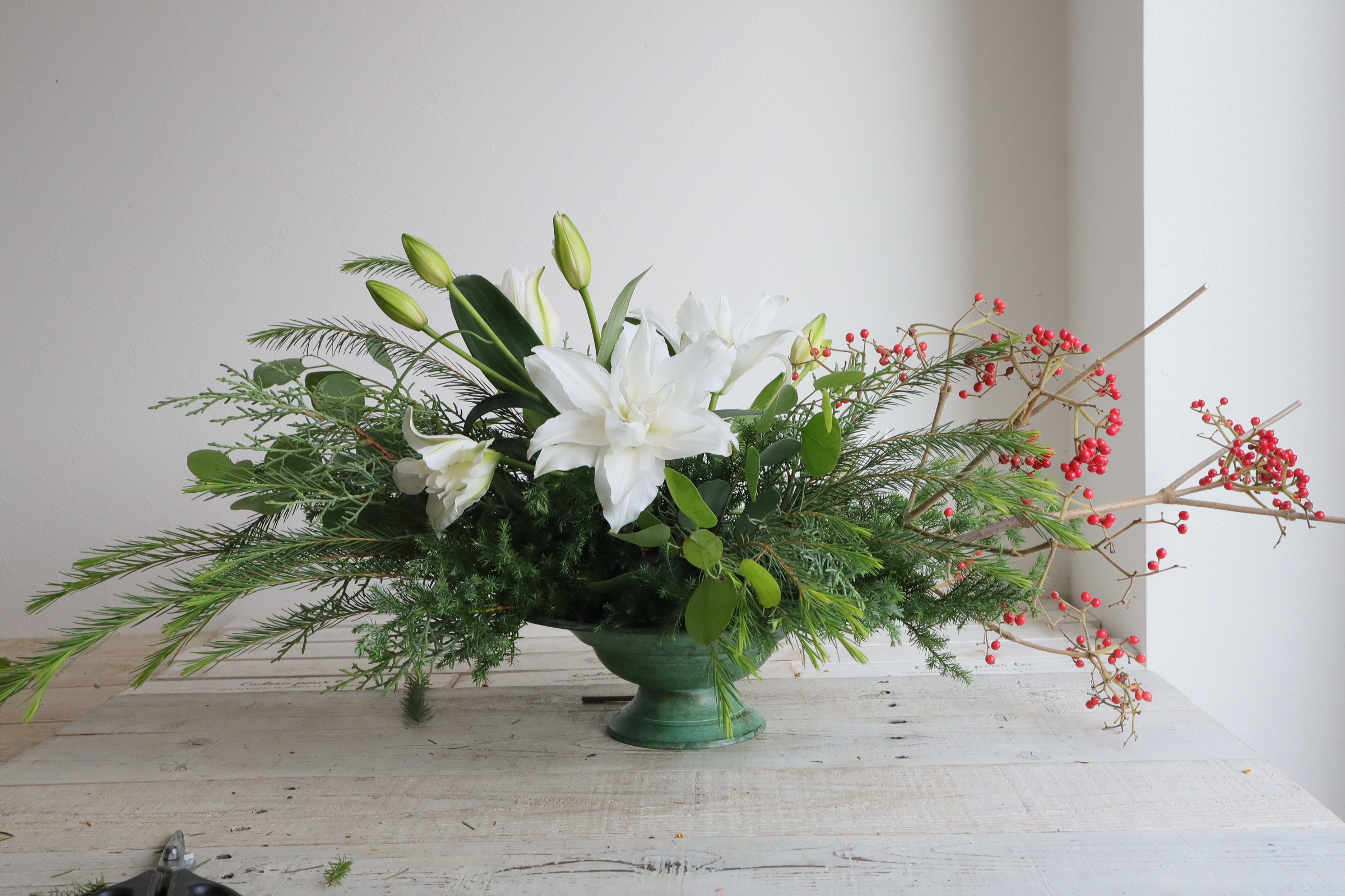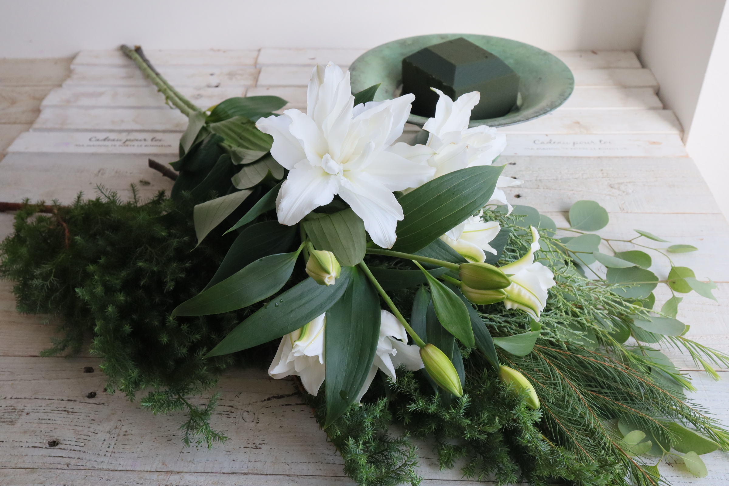 レッスン インテリア/『白いユリにコニファーやグリーンを合わせて』の作り方