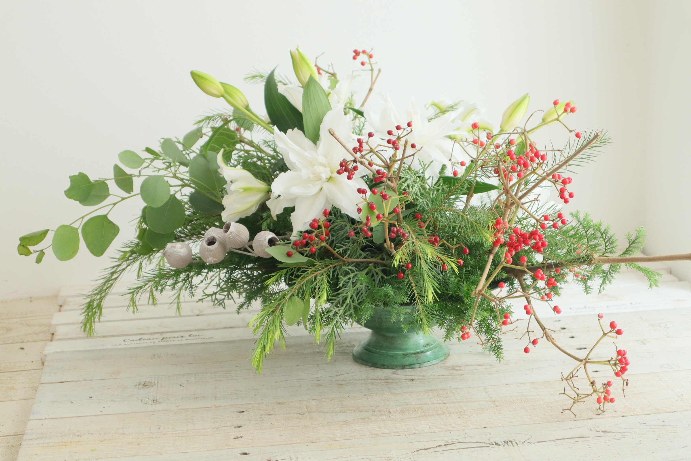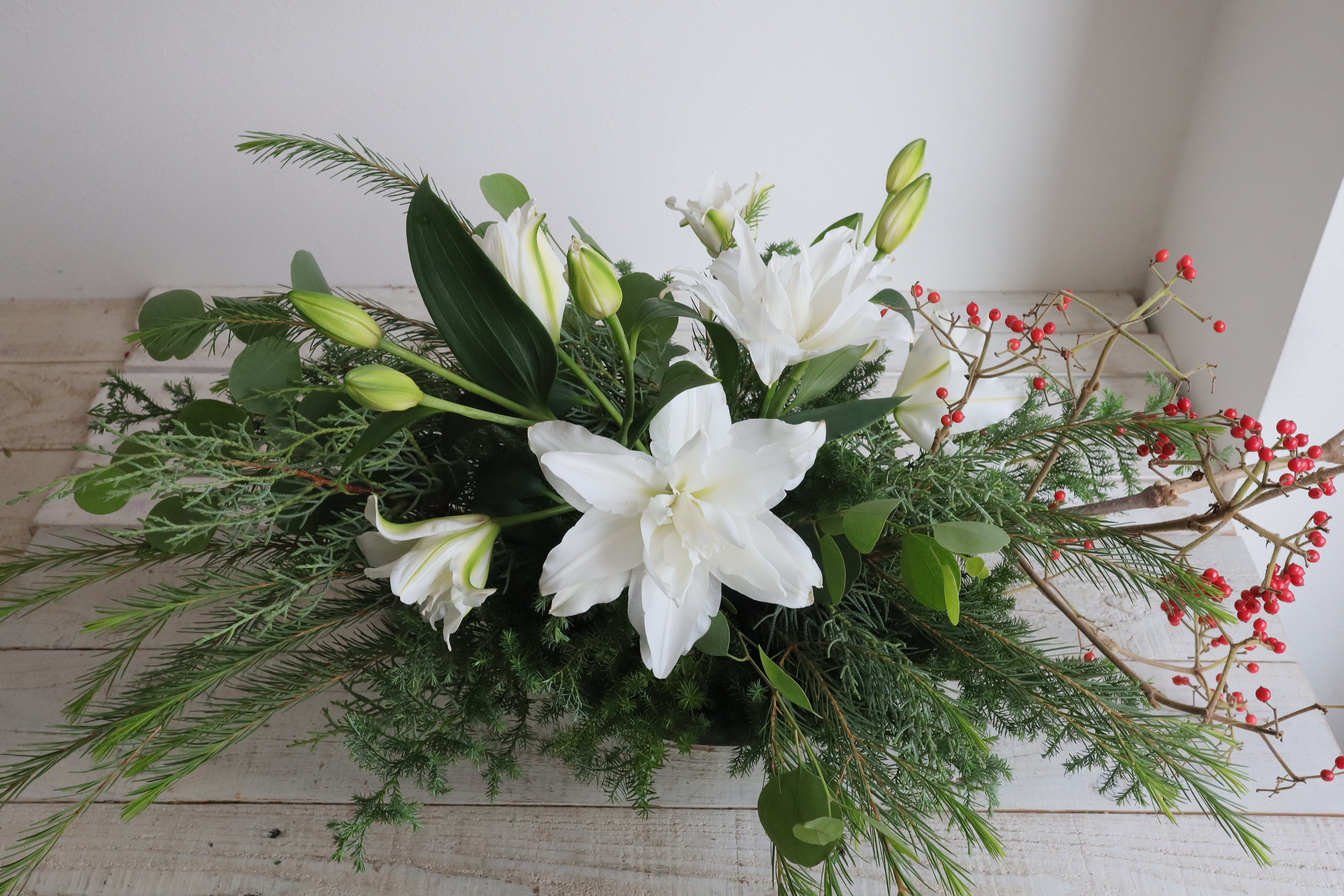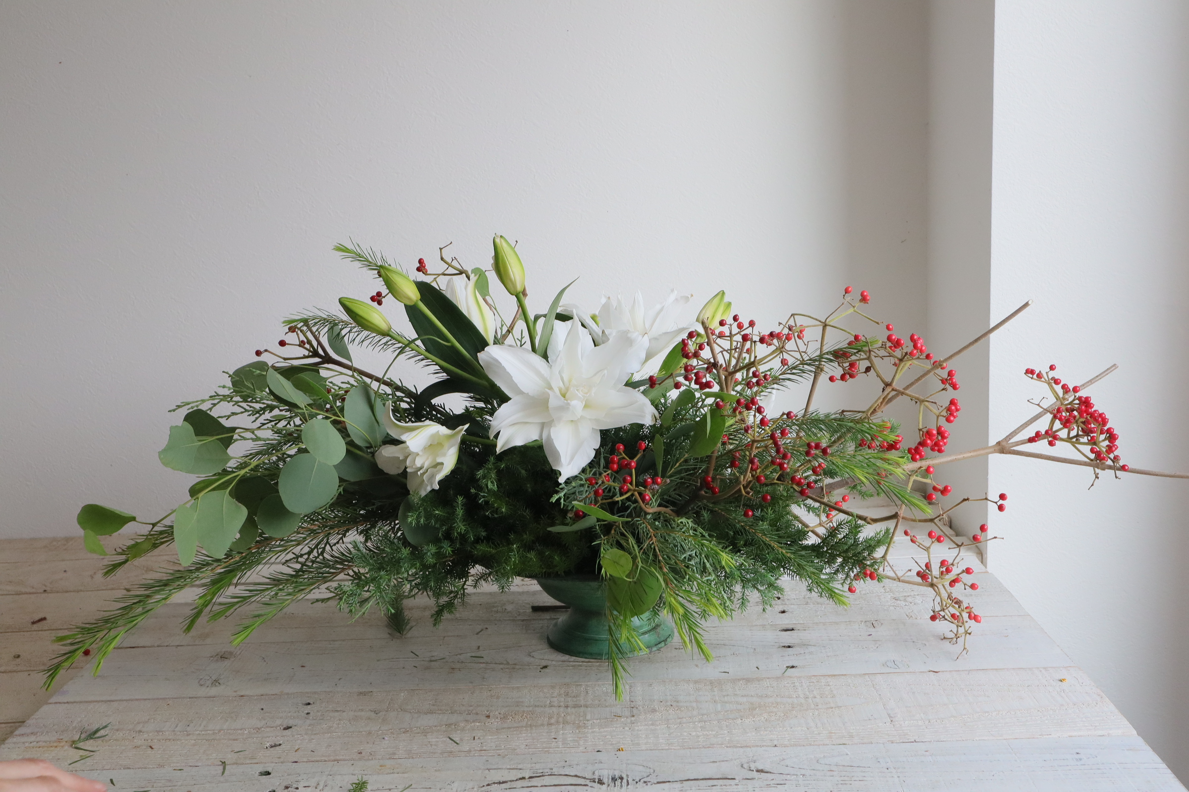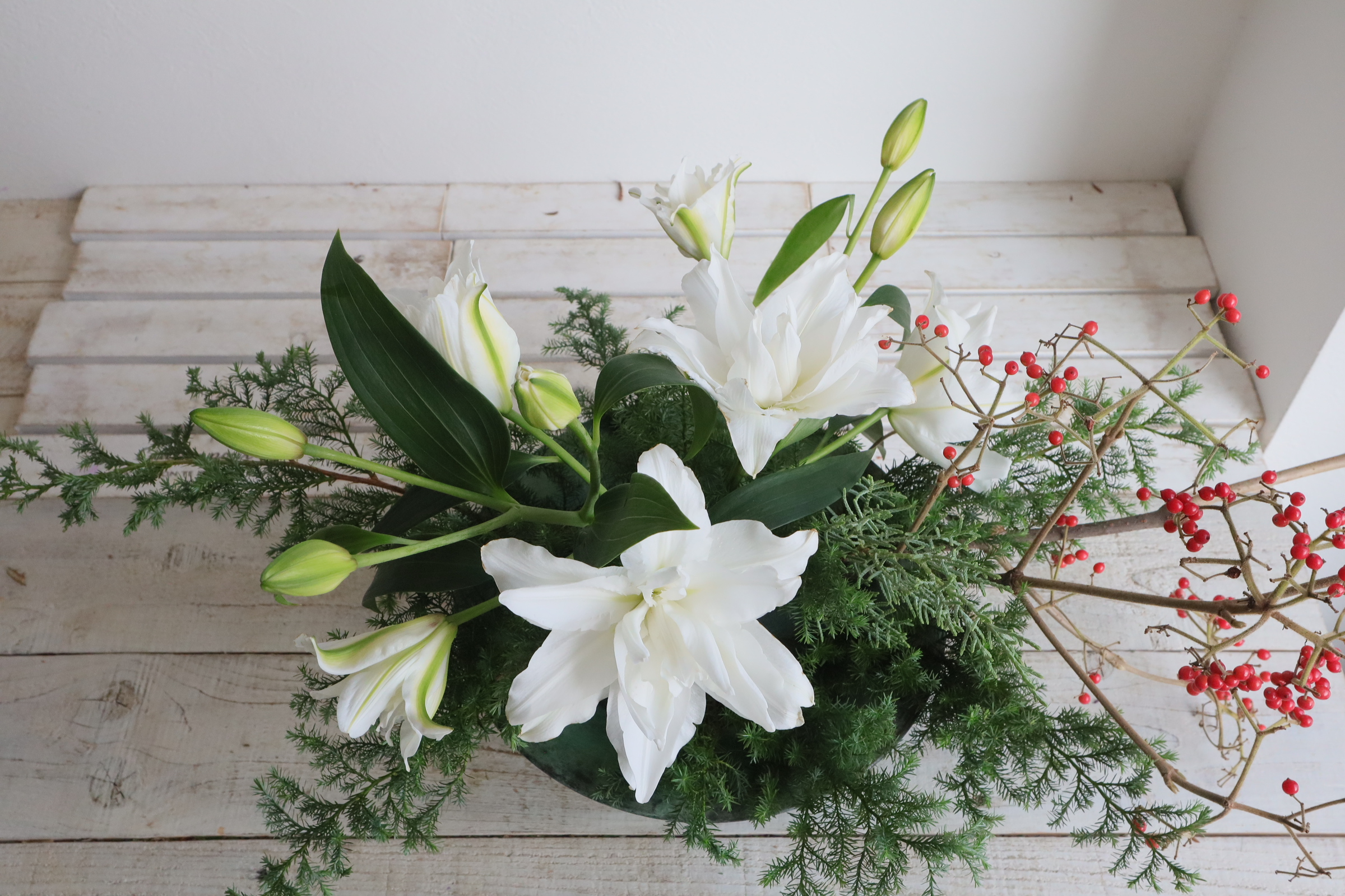 レッスン インテリア/『白いユリにコニファーやグリーンを合わせて』の作り方