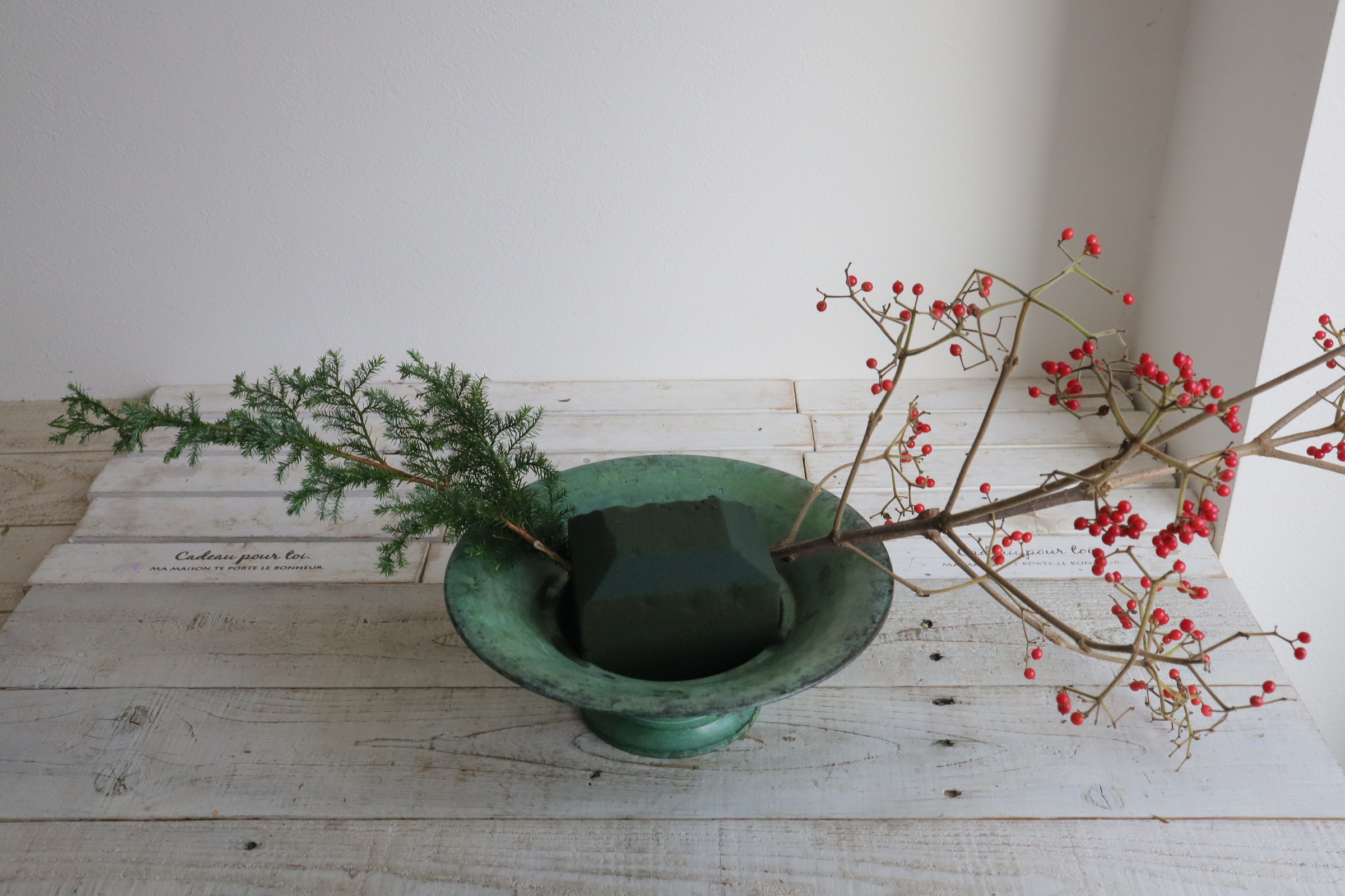 近藤先生「花器にオアシスをセット。 ガマズミとスギでアウトラインを作ります。まずは左右の大きさをとります。」