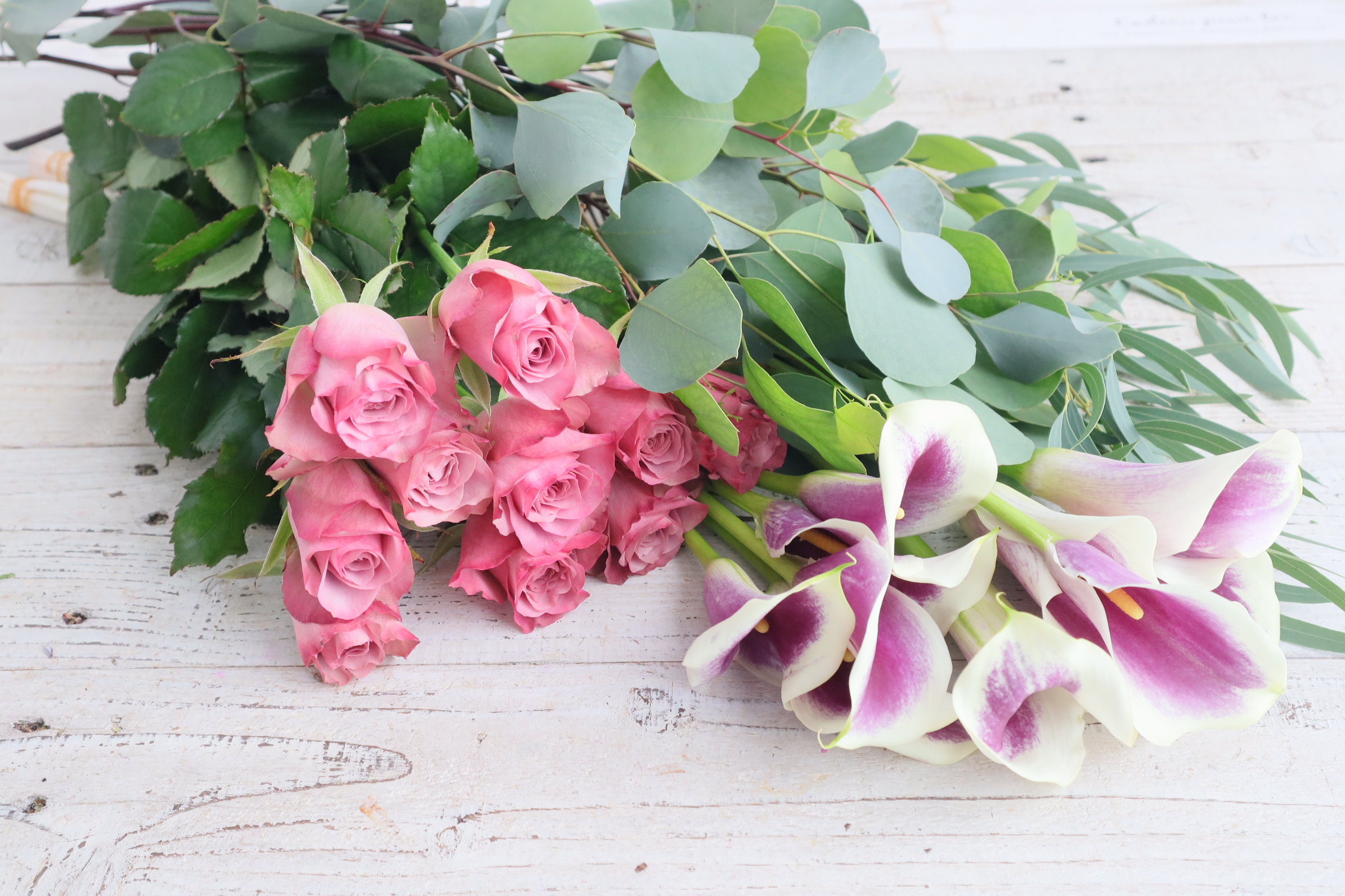 近藤先生「バラ、 カラー、 ユーカリの葉物2種類です。  」