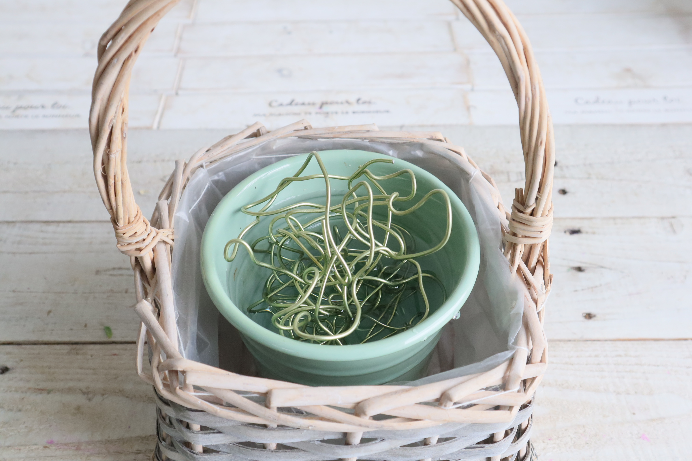 近藤先生「春っぽい色のバスケットにアレンジします。 中に入る花器にワイヤーで花留めをします。」