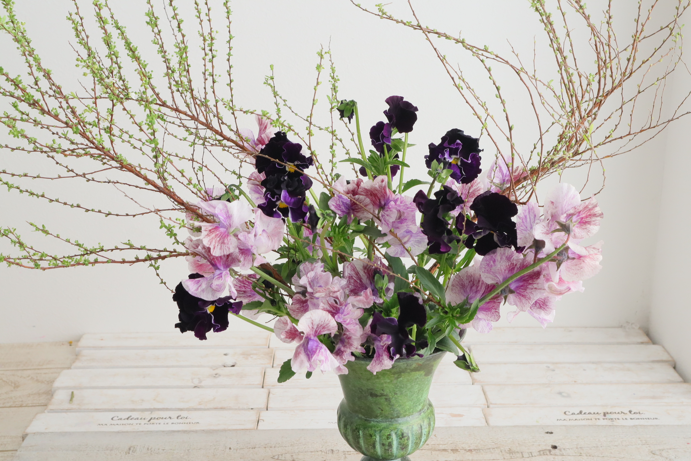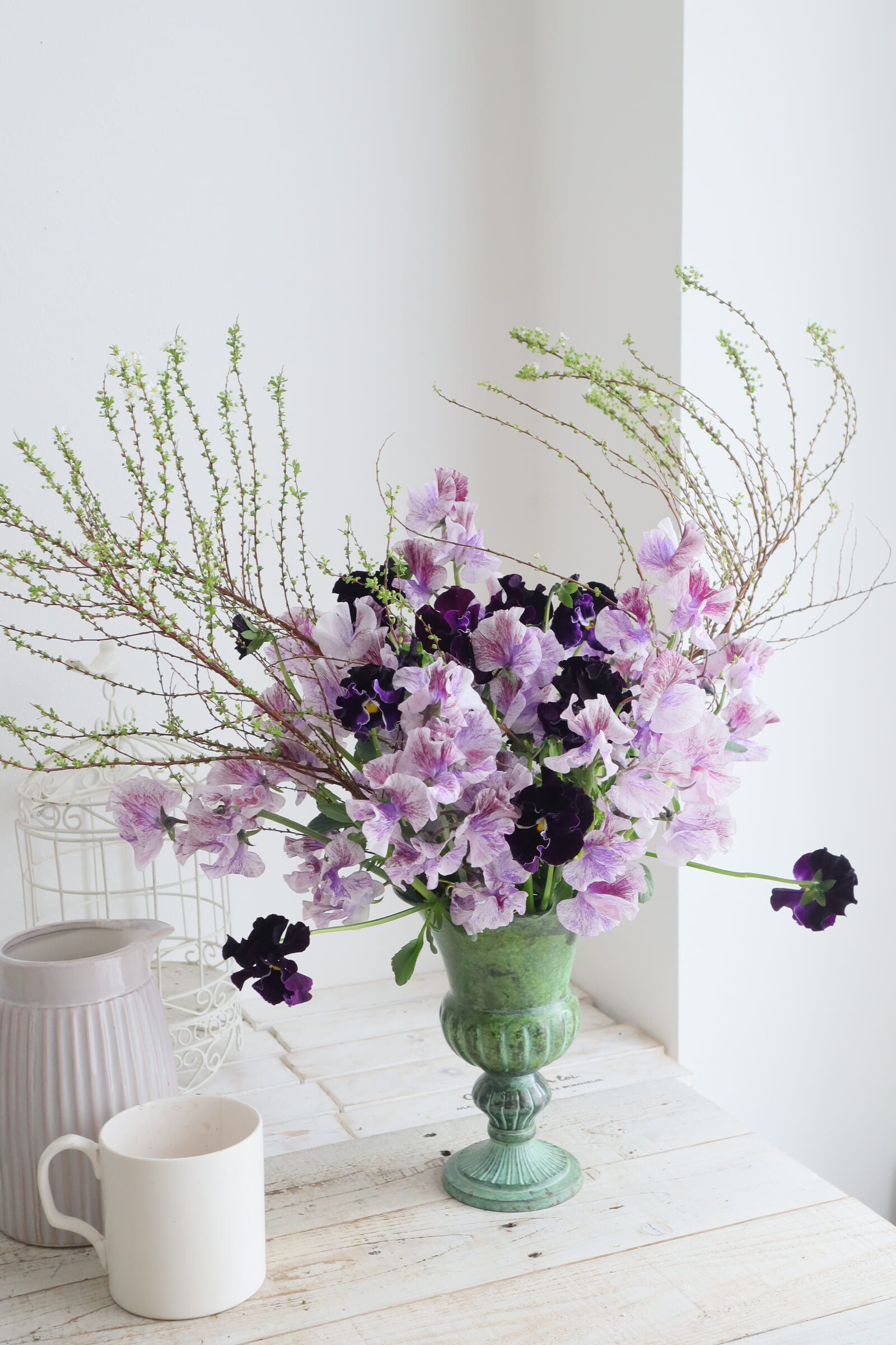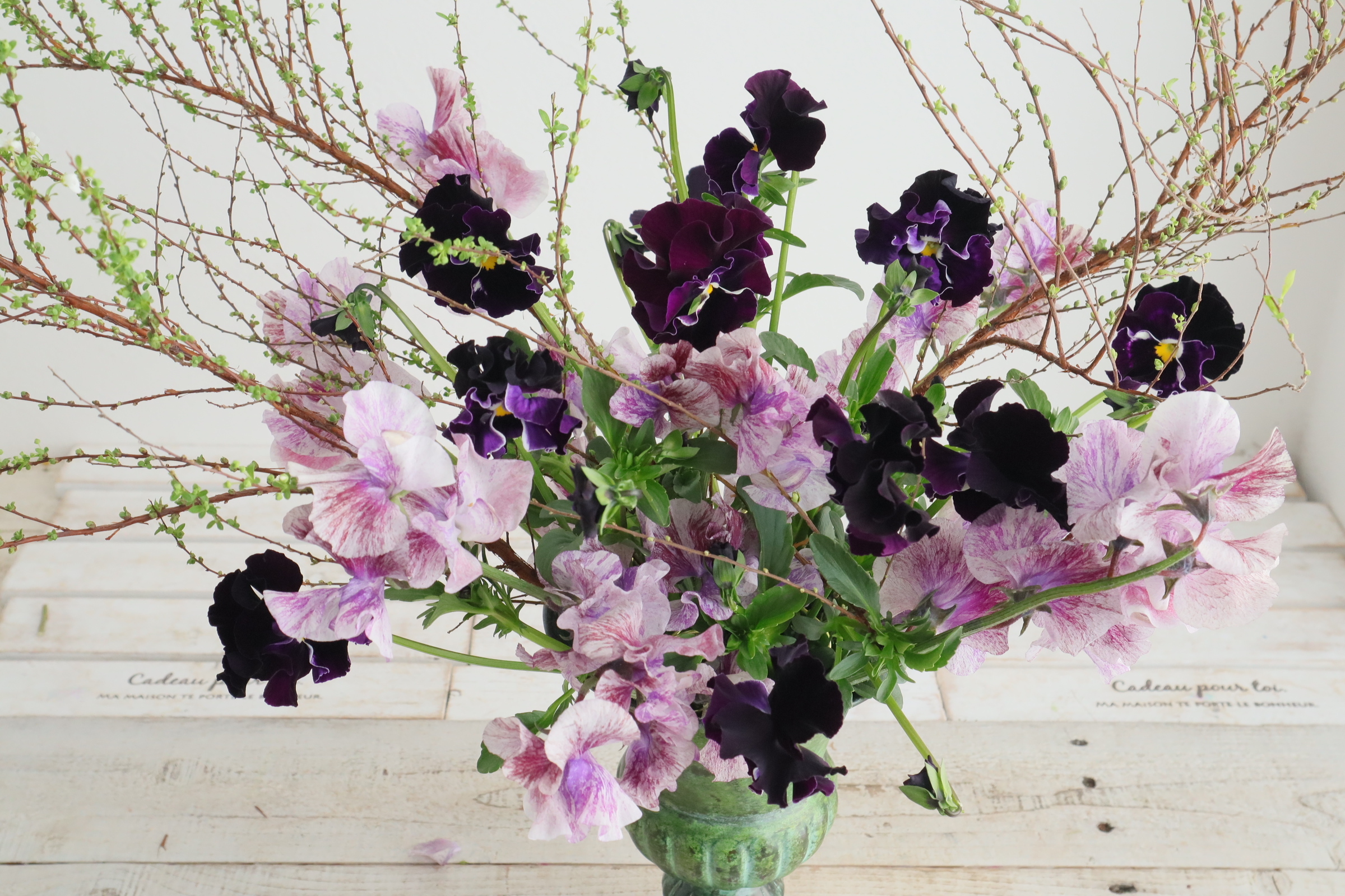ふわふわとした優しい質感のスイトピーとパンジーを合わせた投げ入れです。 繊細な植物ですので、スポンジよりはワイヤーなどの花留めが、水が上がりやすくいいかと思います。