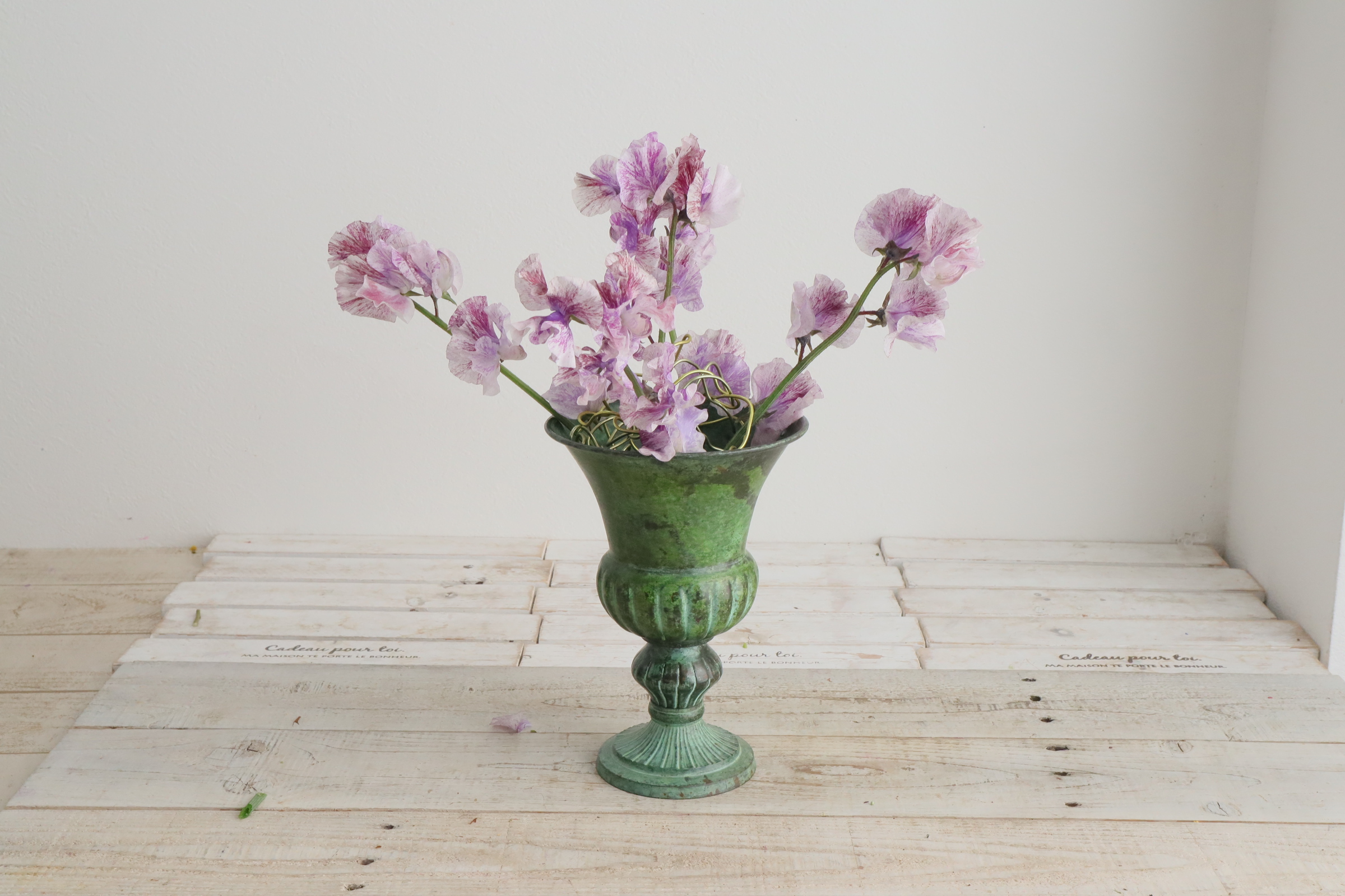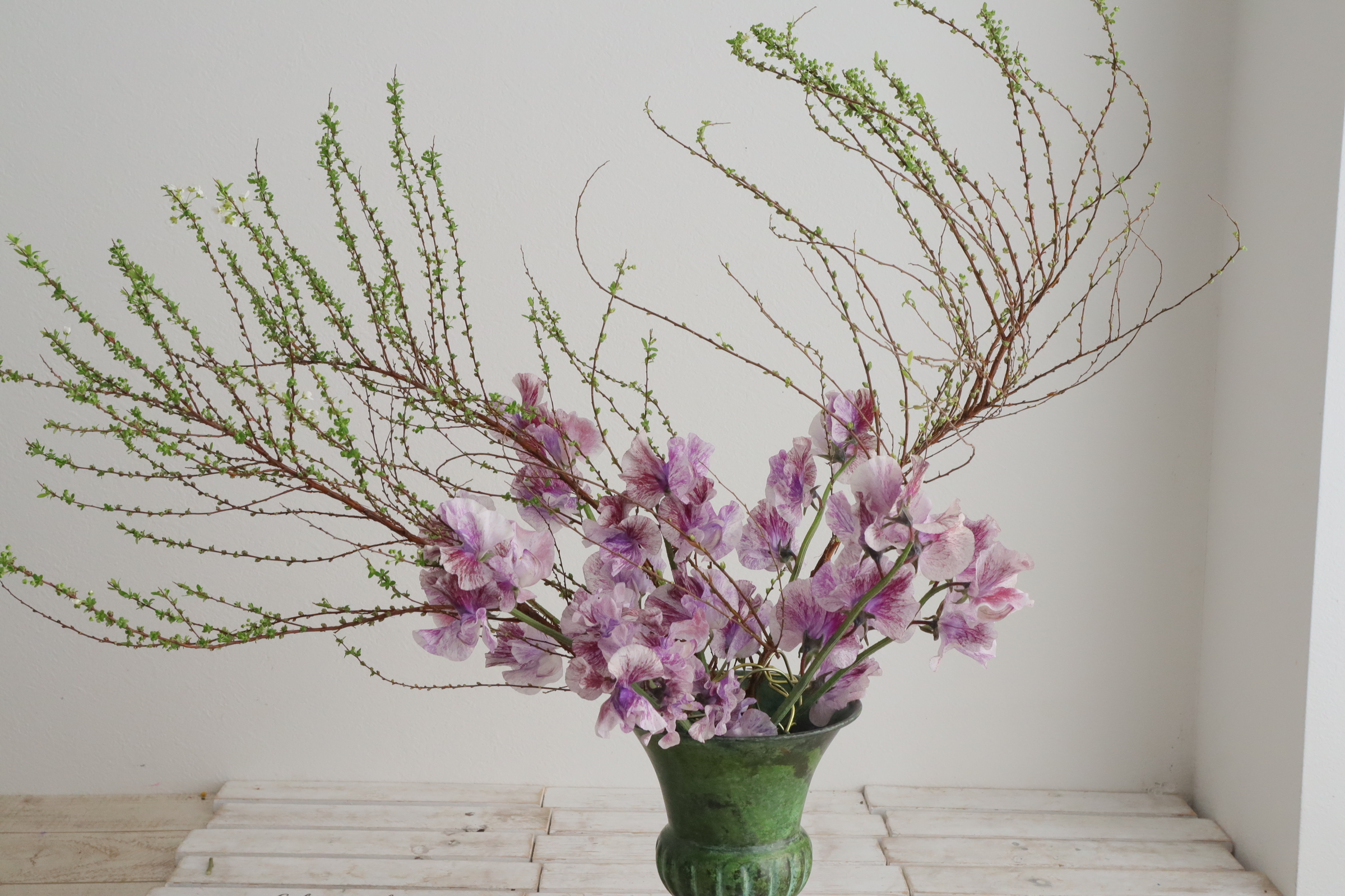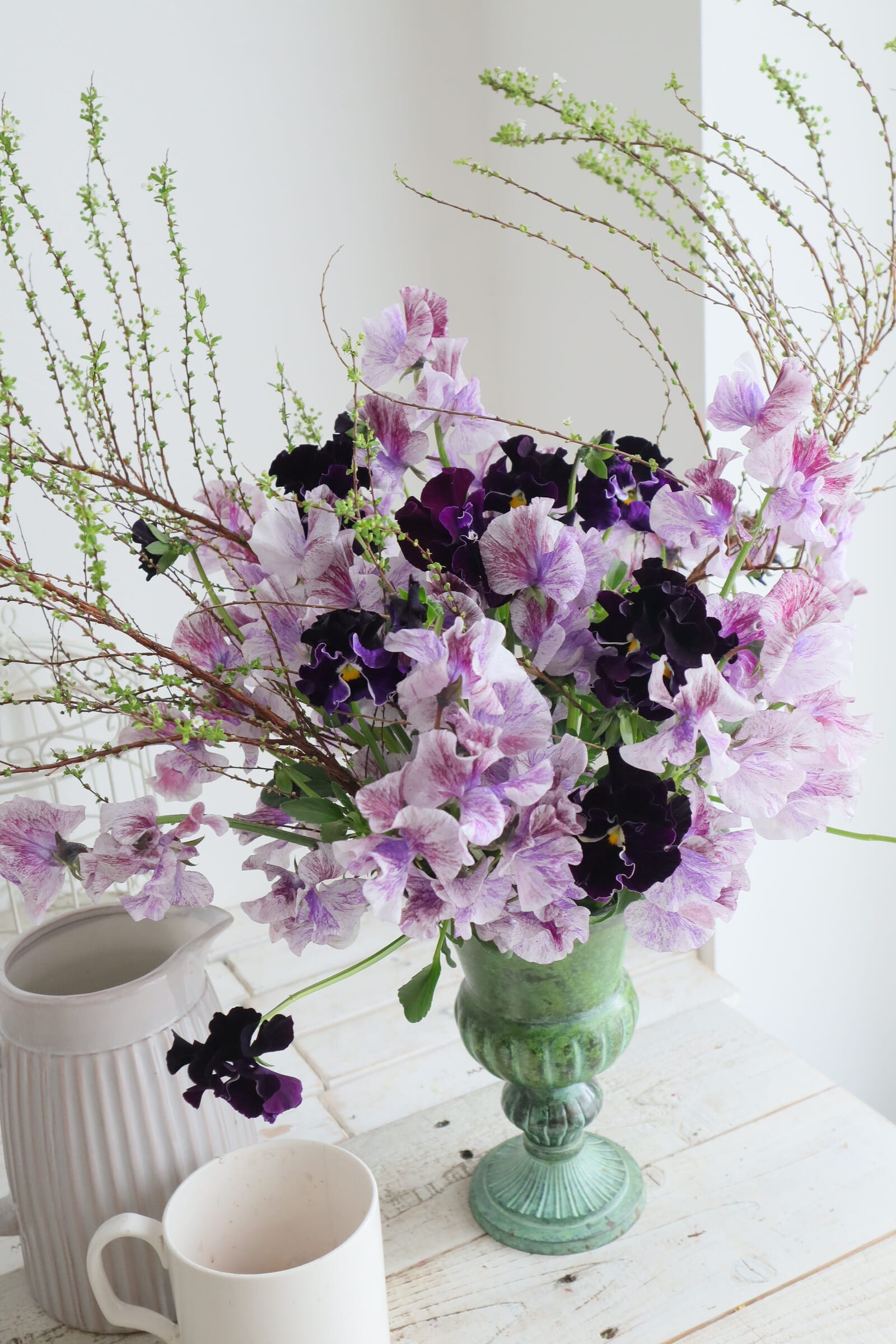 ふわふわとした優しい質感のスイトピーとパンジーを合わせた投げ入れです。 繊細な植物ですので、スポンジよりはワイヤーなどの花留めが、水が上がりやすくいいかと思います。