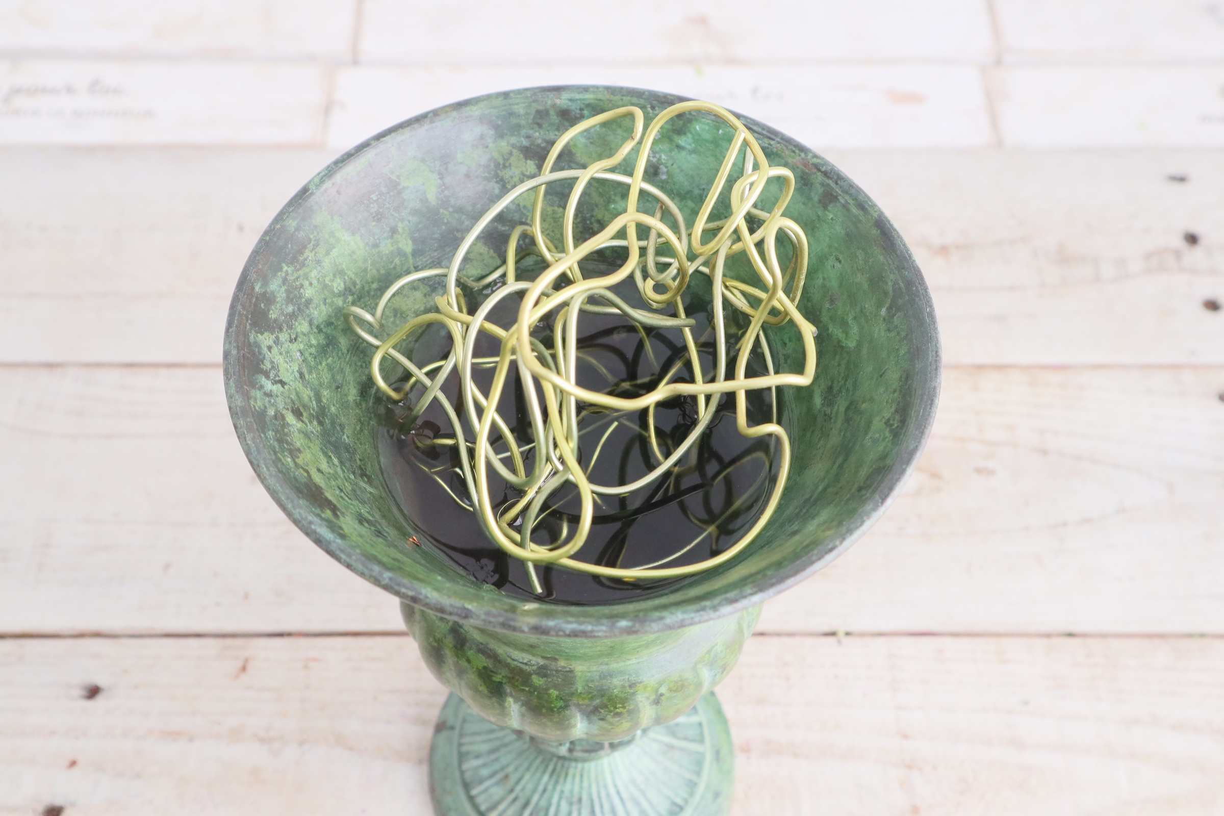 近藤先生「花器にアルミワイヤーを入れ、花留にします。」
