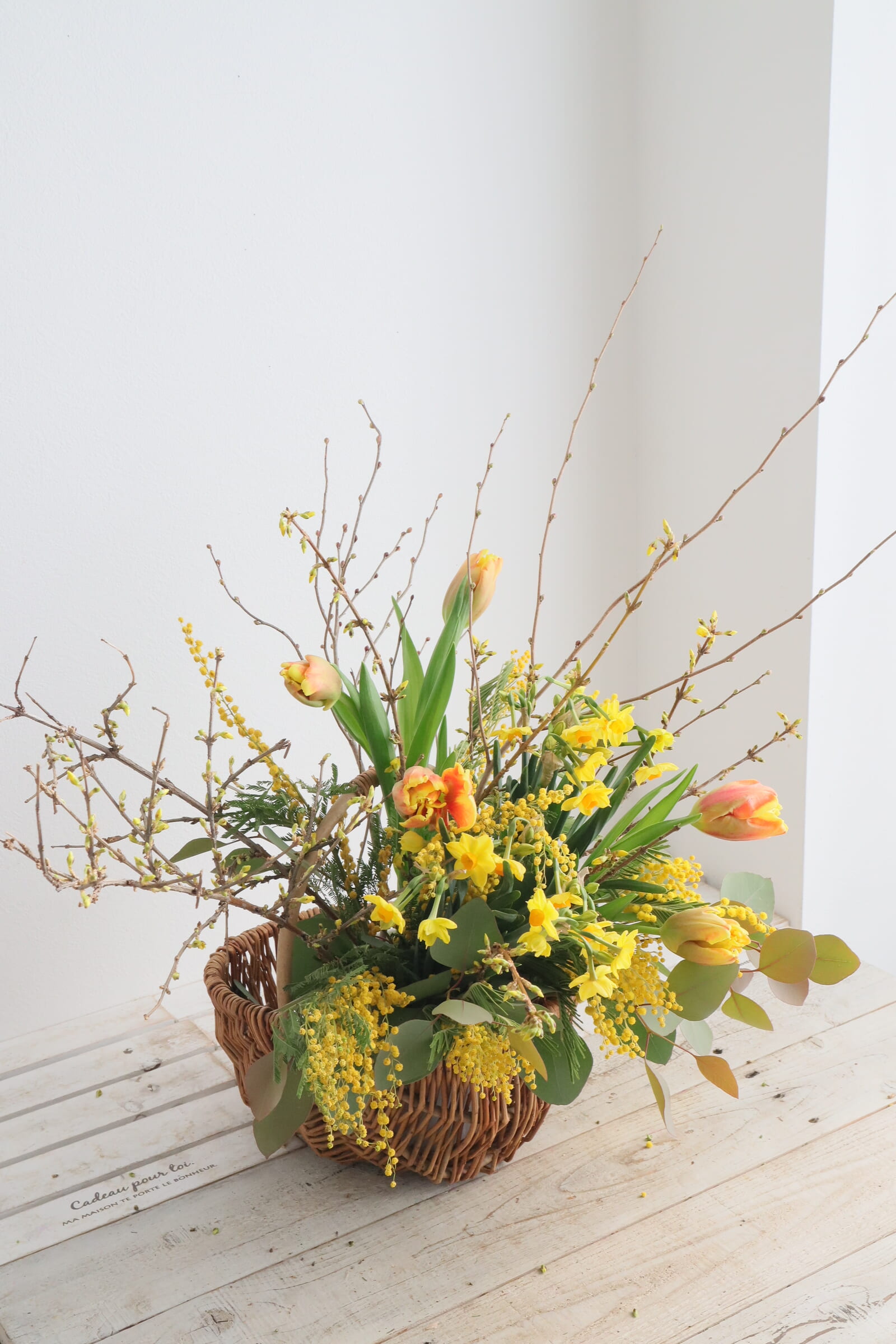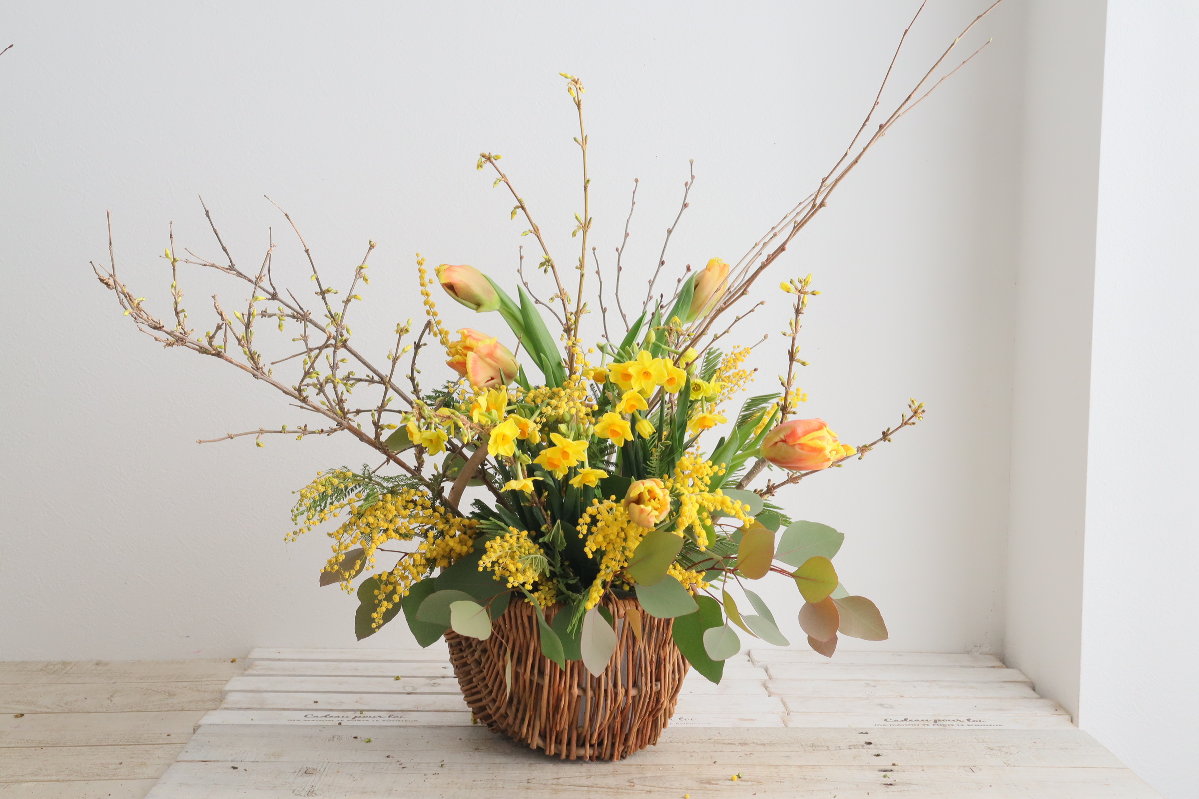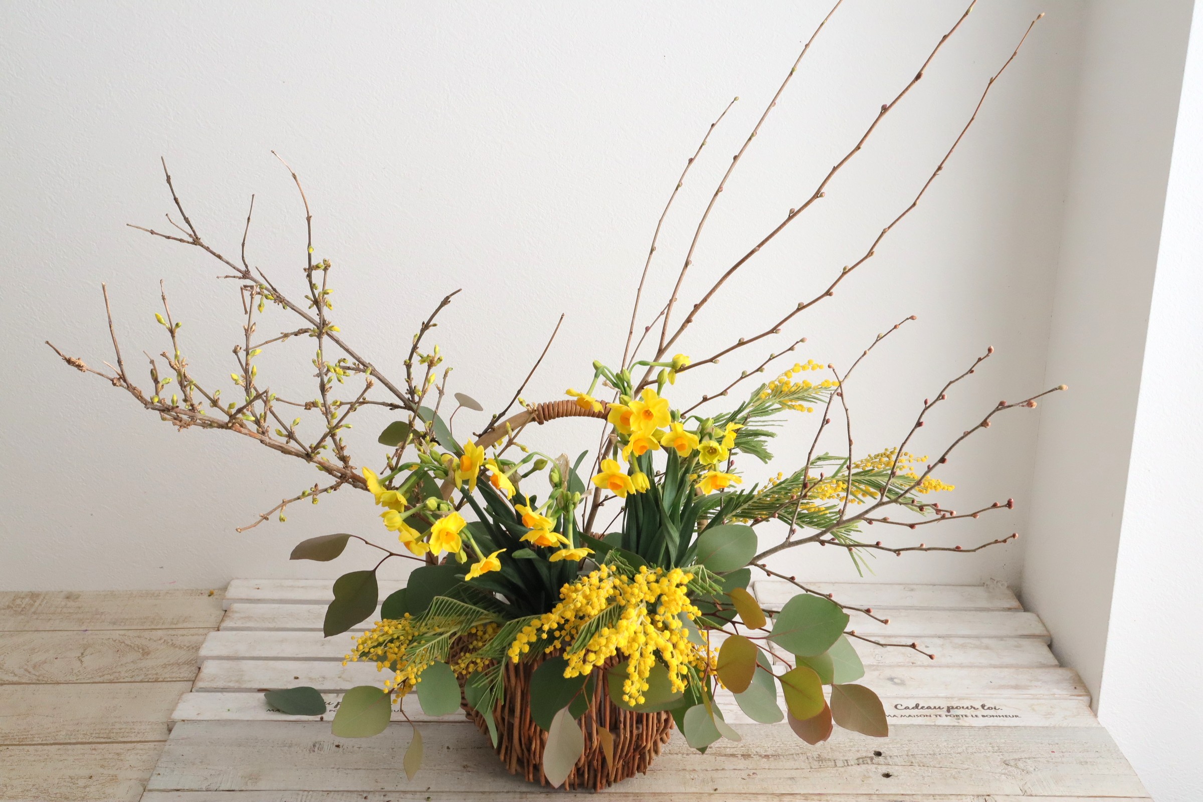 ミモザやレンギョウ、寒い時期から春を告げる黄色い花木が旬の時期です。 他にも、サンシュユやロウバイもあります。 花木を集めて投げ入れにしましょう。
