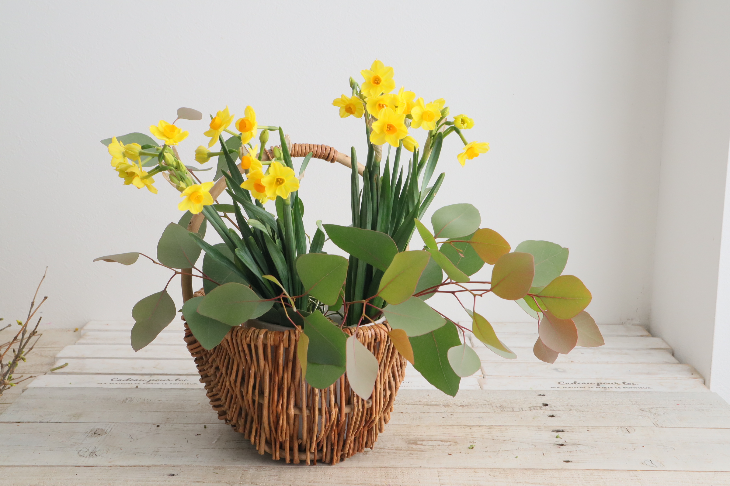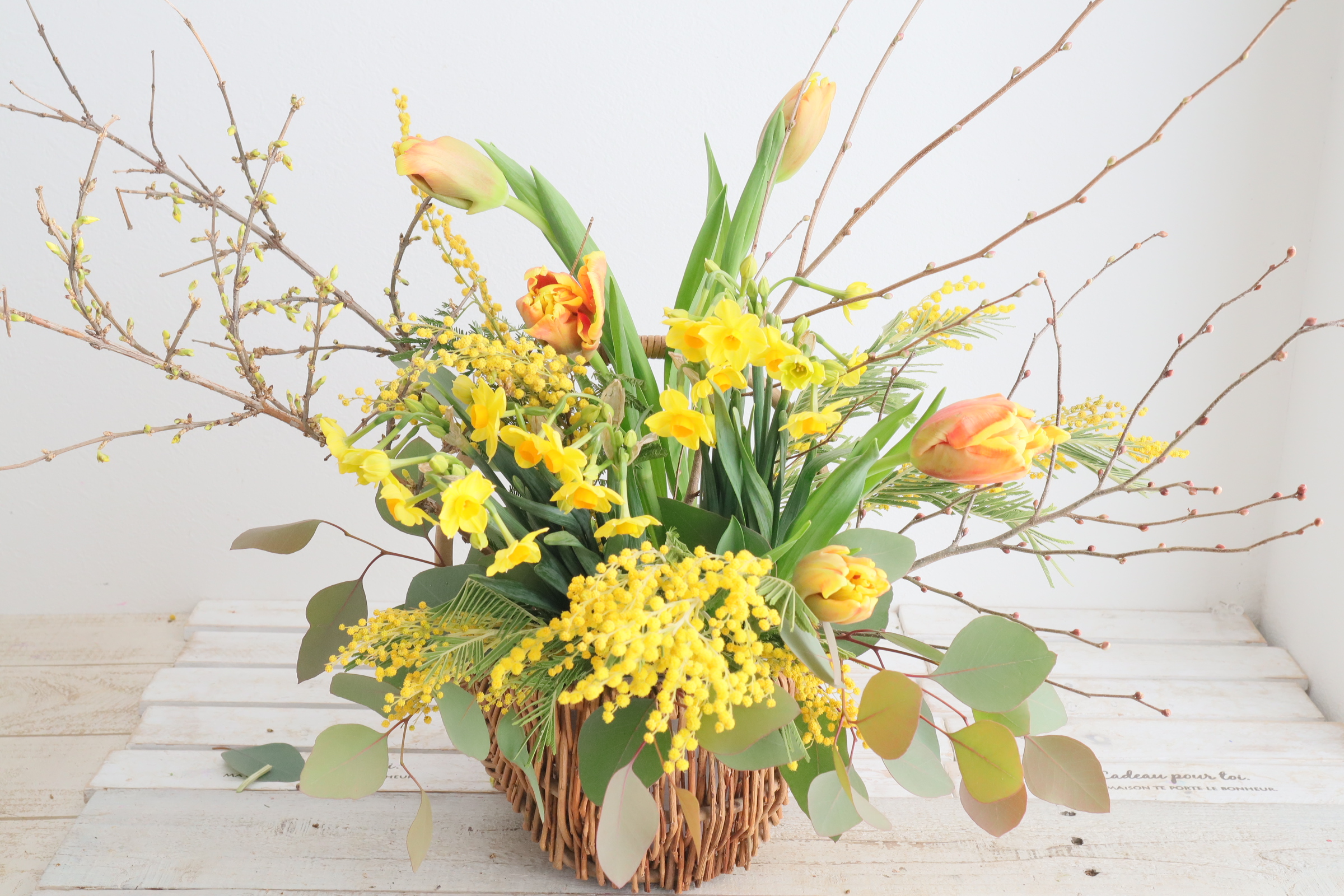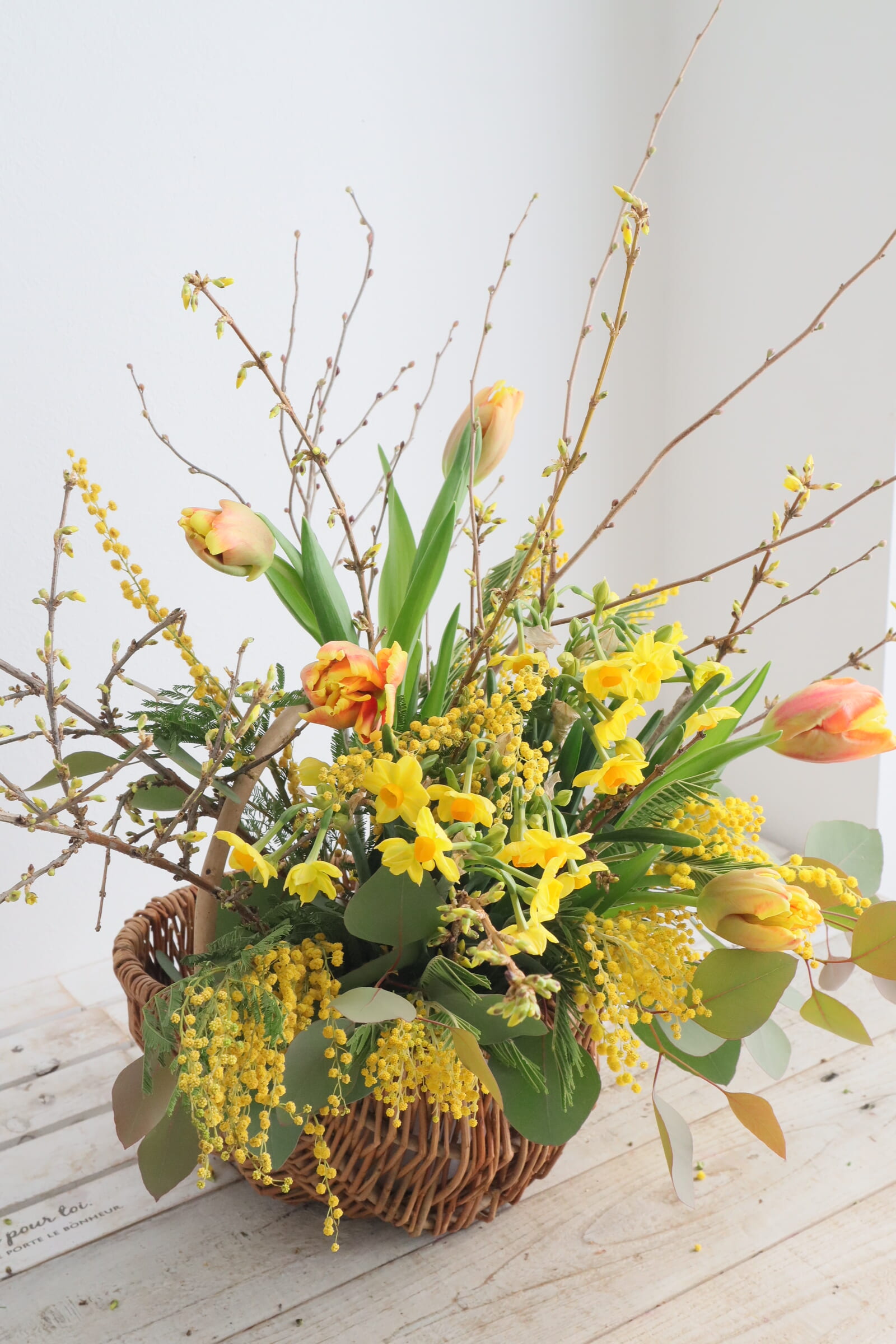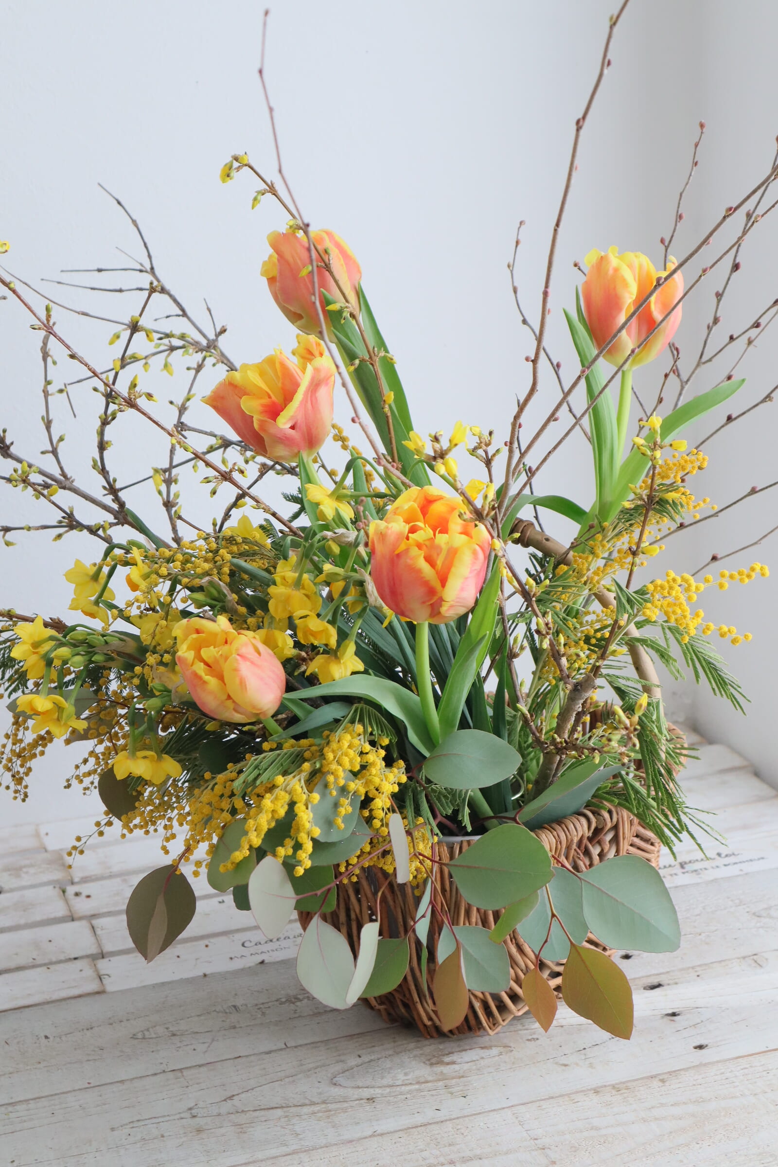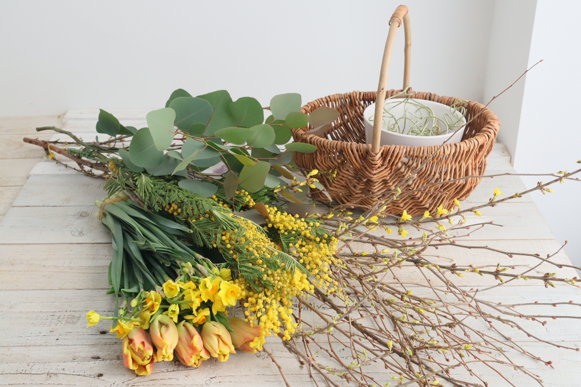 近藤先生「黄色の花木とチューリップです。 枝物にユーカリを用意しました。」