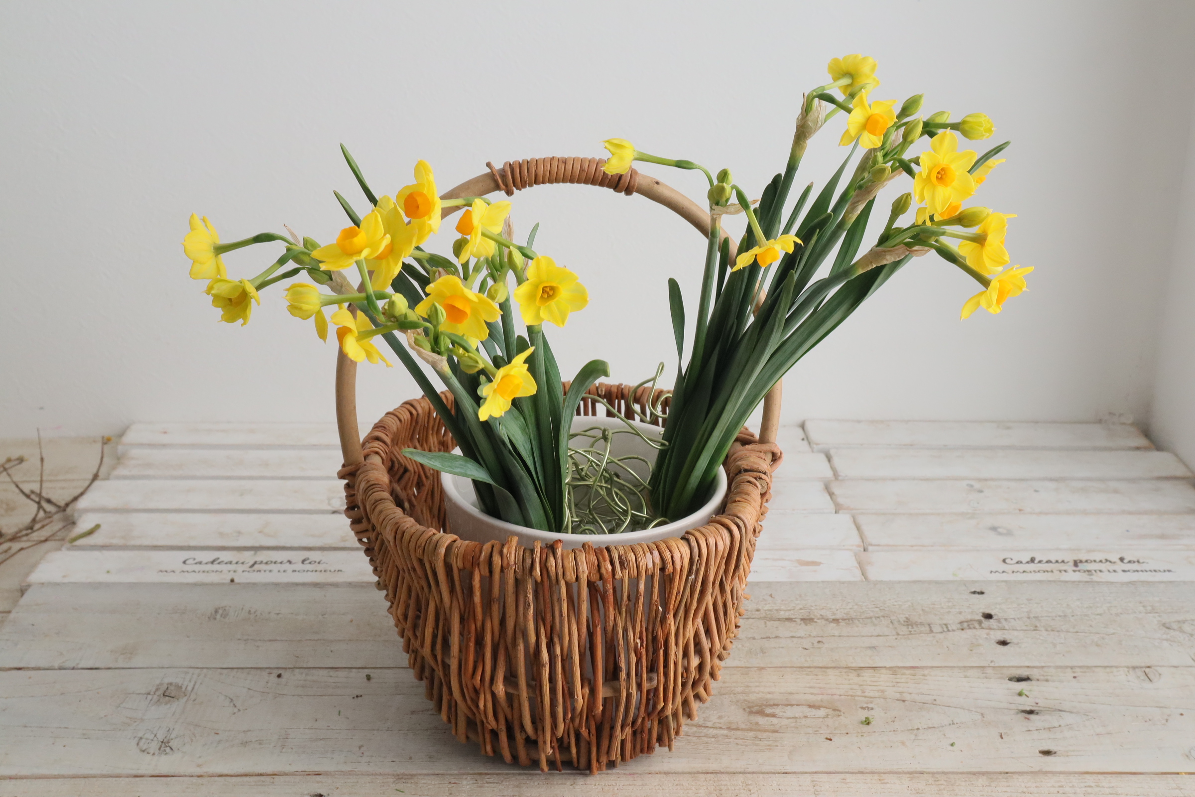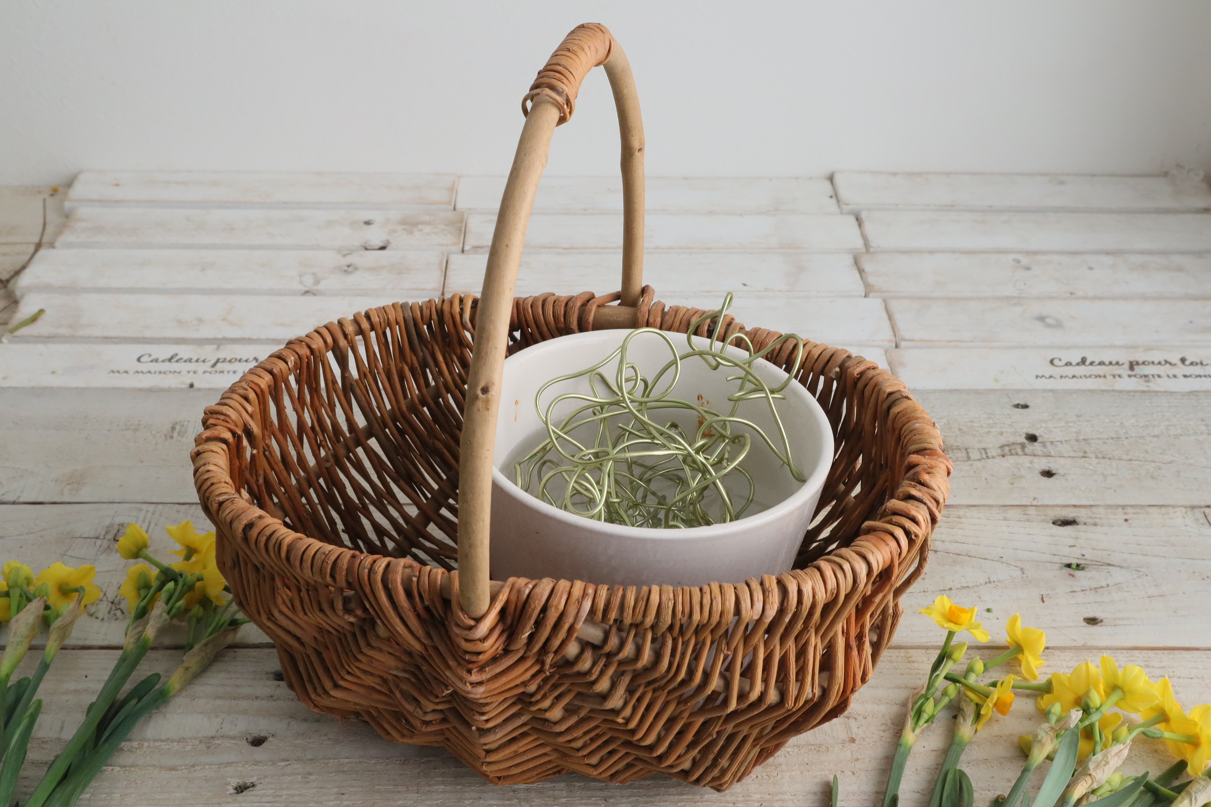 近藤先生「花器にアルミワイヤーを入れ、バスケットにセットします。 バスケットで春らしさを。」