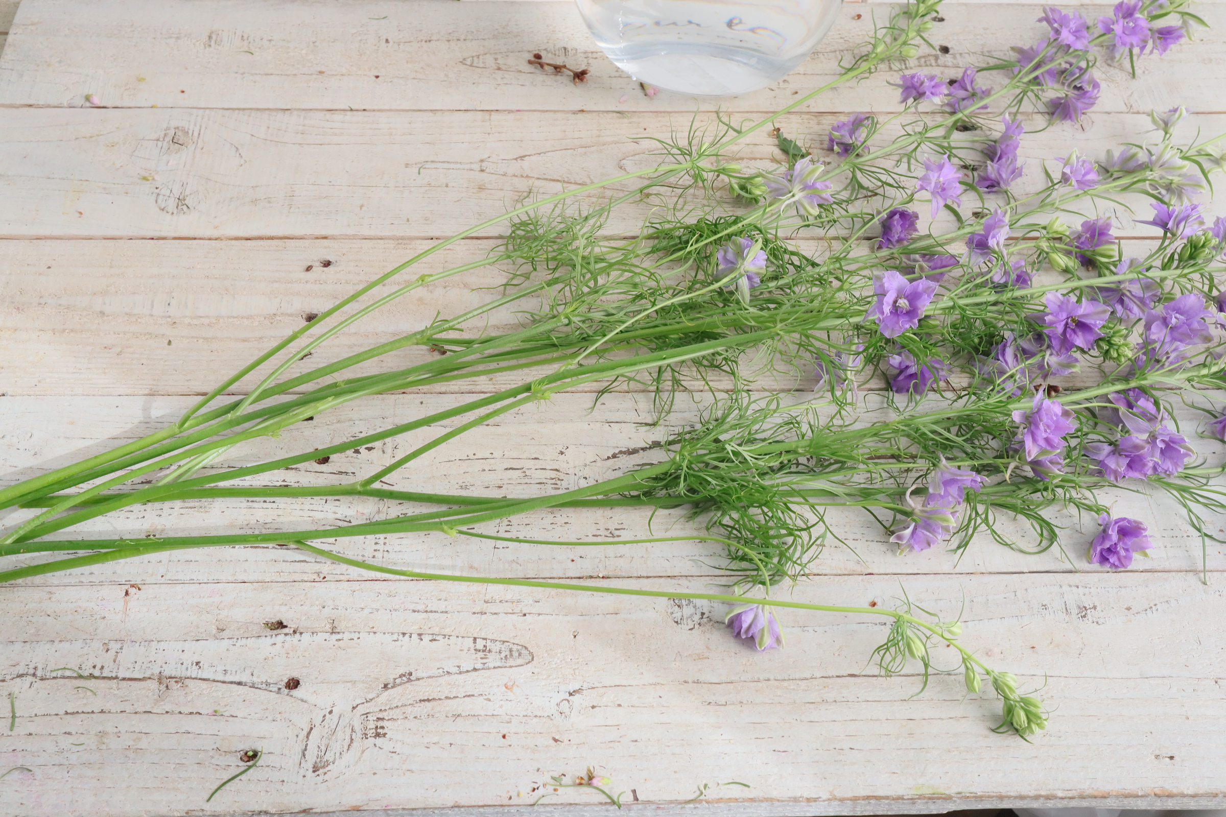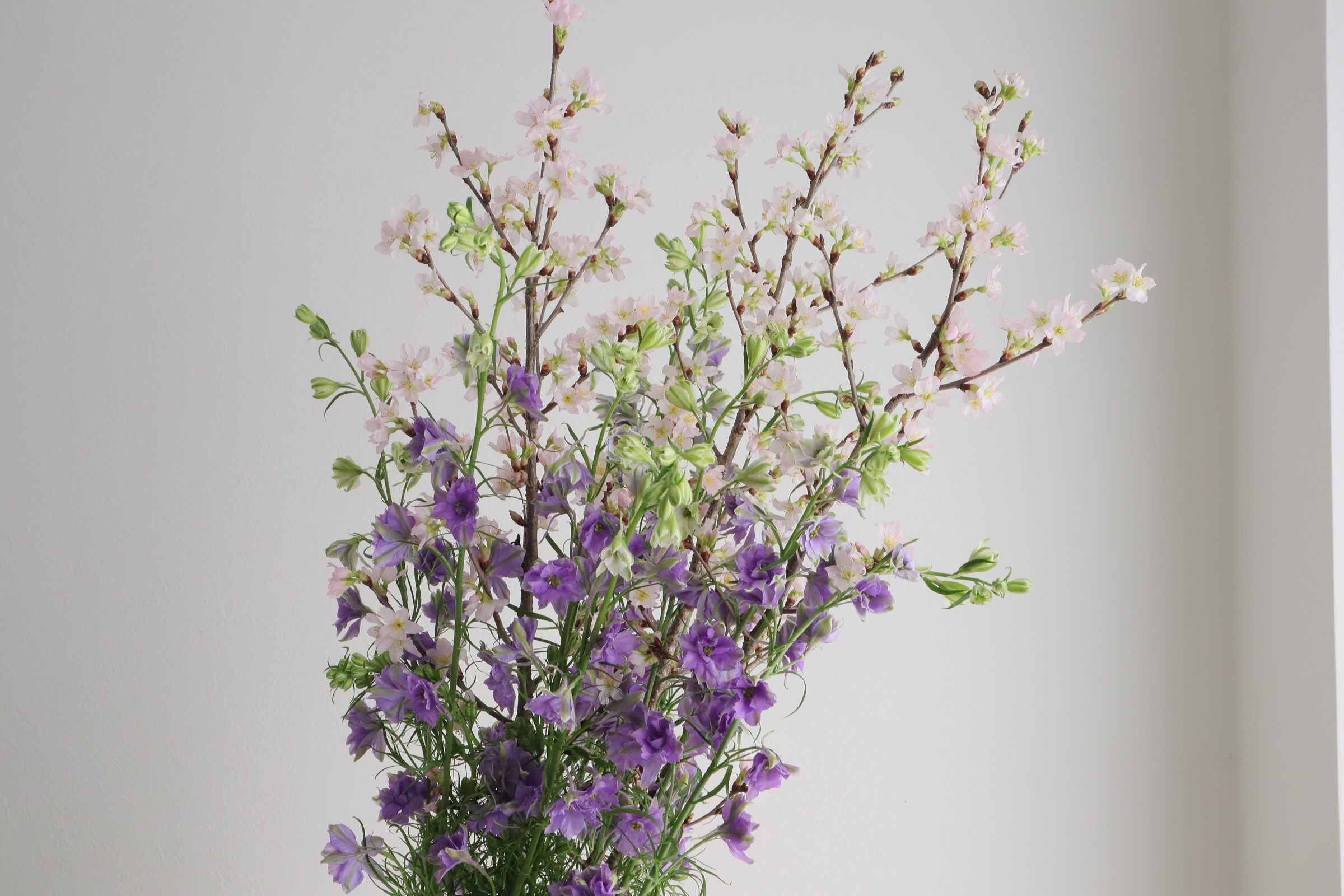 春が旬のラクスパーをいけます。 桜の花と合わせて、縦長に入れます。