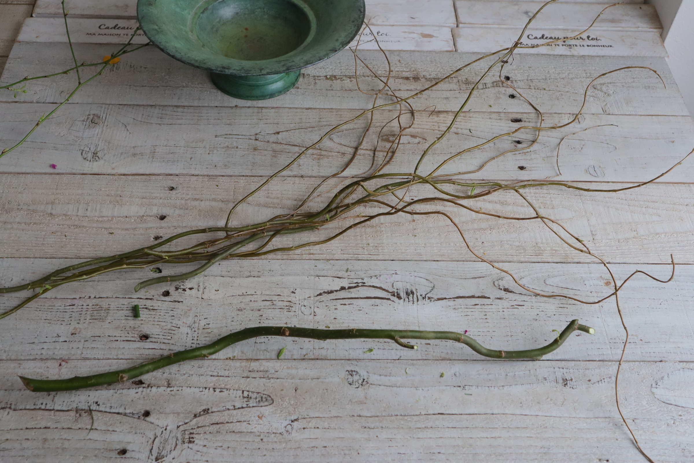 近藤先生「雲竜柳を切り分けます。 太い枝の部分は取り除き、曲げやすい柔らかい枝の部分を使ってリースにします。」