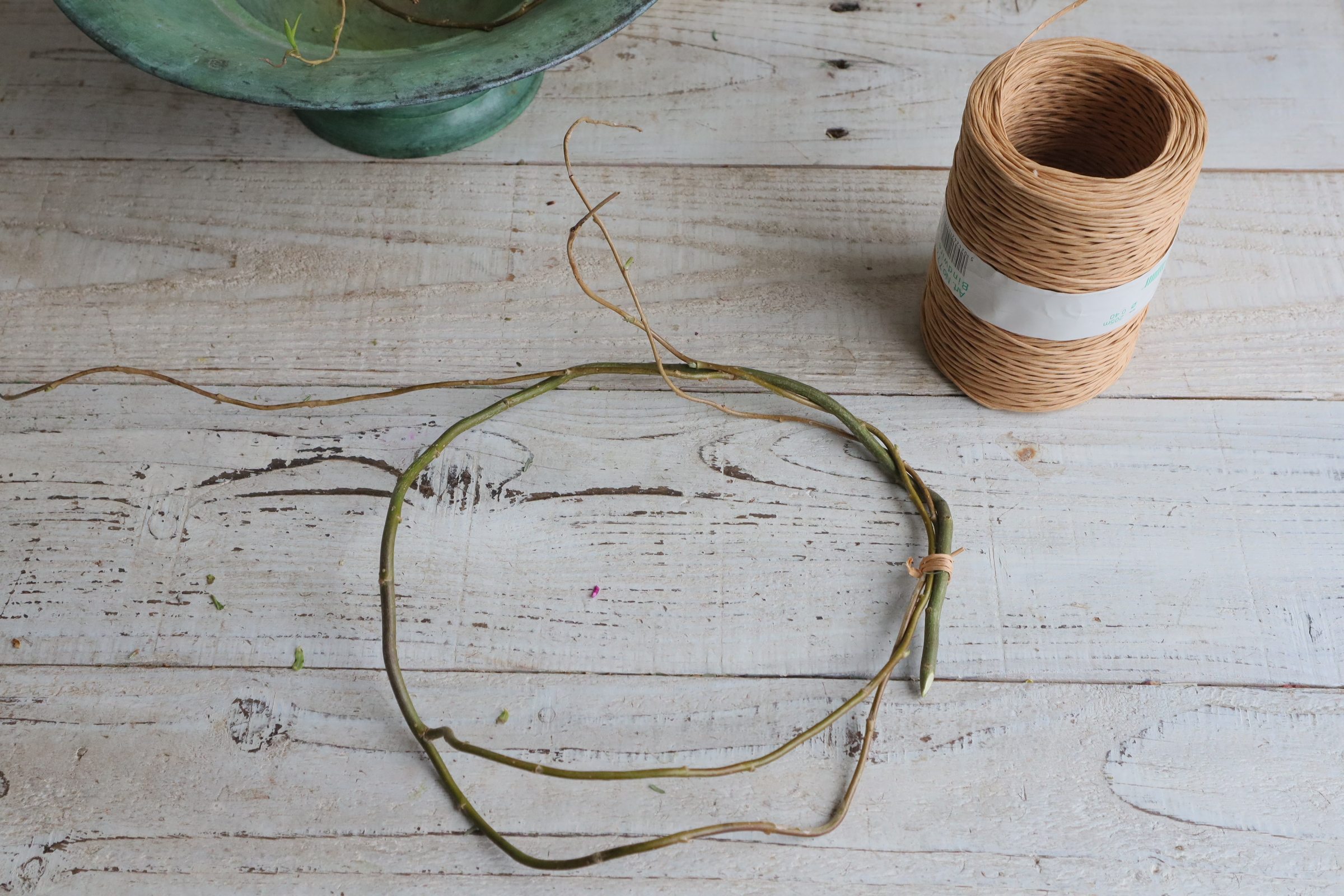 近藤先生「少しずつ輪にして、ワイヤーで留めます。 これを数個作ります。 輪の大きさは、使う花器の大きさに合わせましょう。」