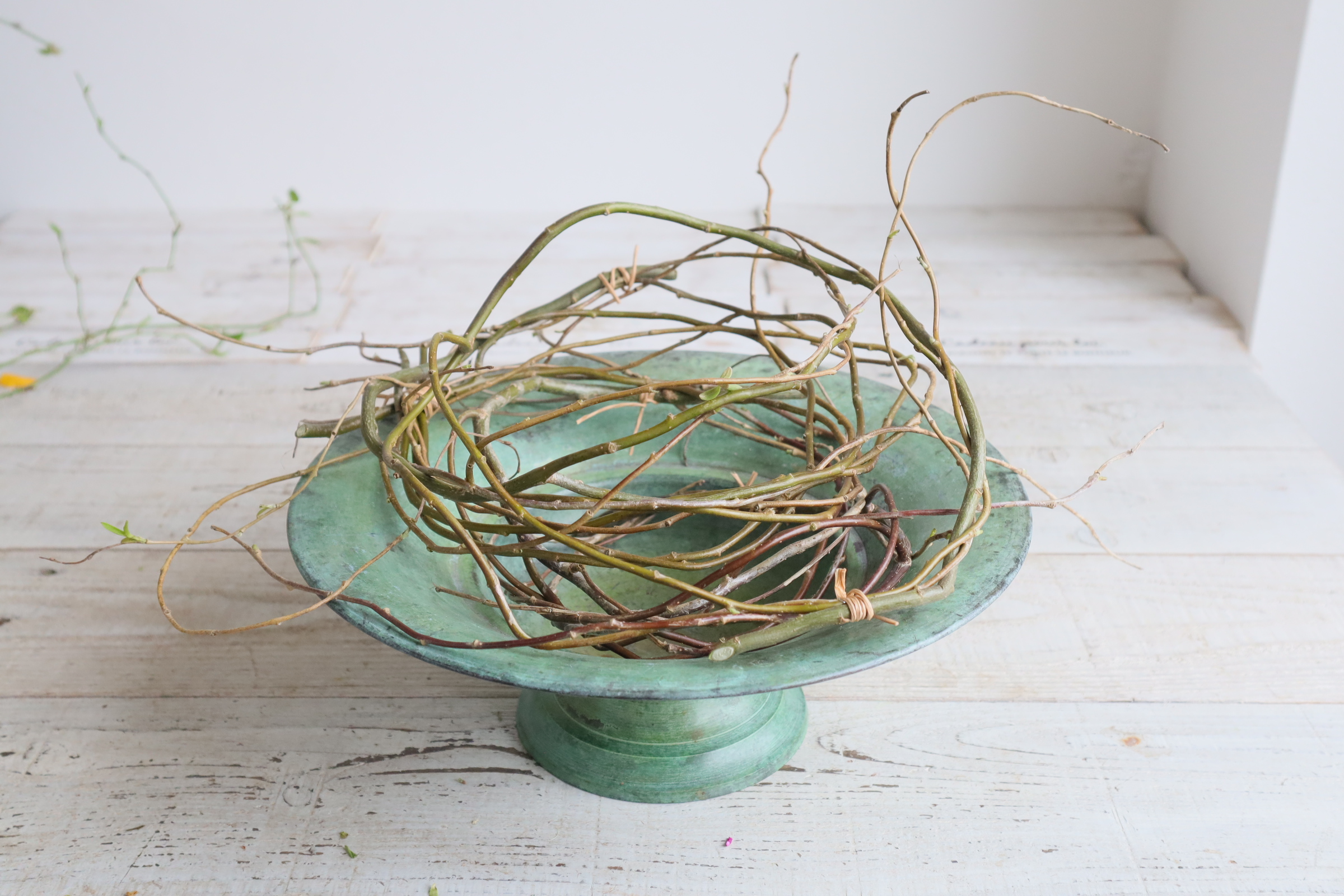 近藤先生「輪にした雲竜柳を器の上に重ねます。 落ちないように、ワイヤーで数カ所留めてます。」