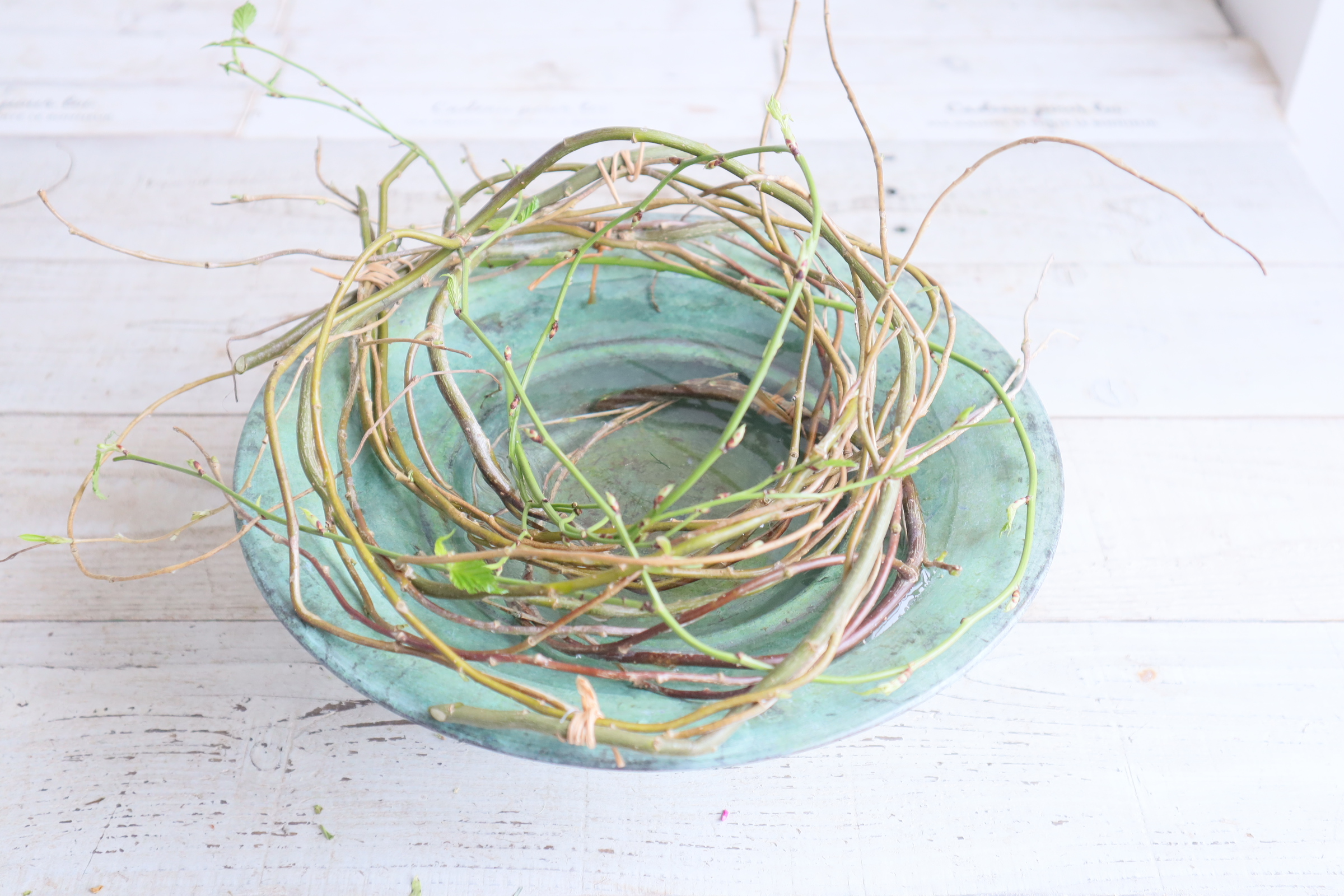 芽吹きのこの時期らしい、水盤を使ったリースです。 イースターぽい雰囲気もあります。