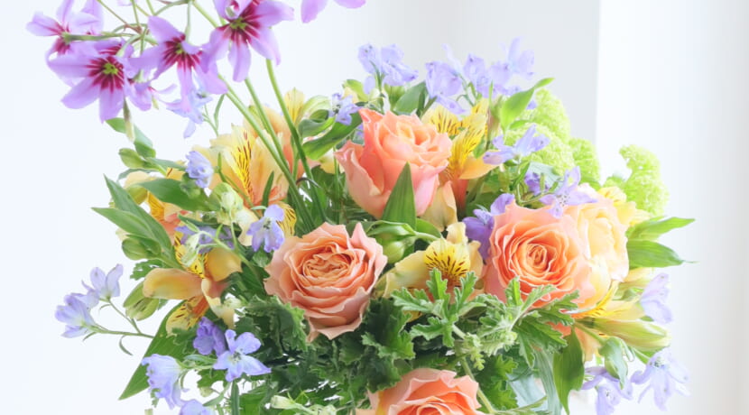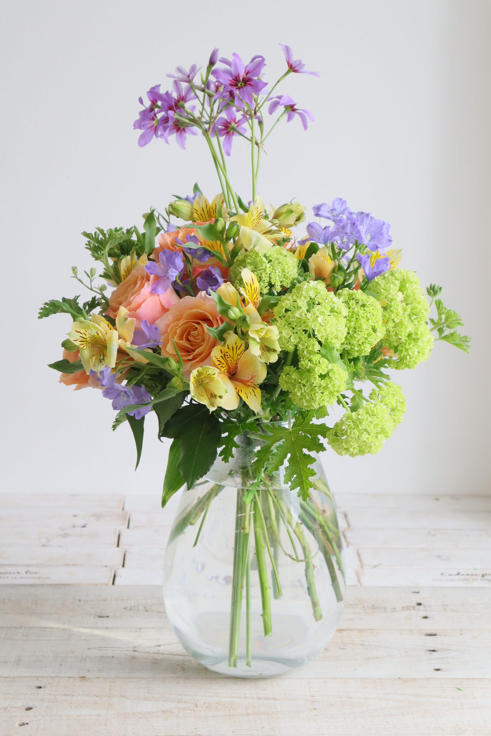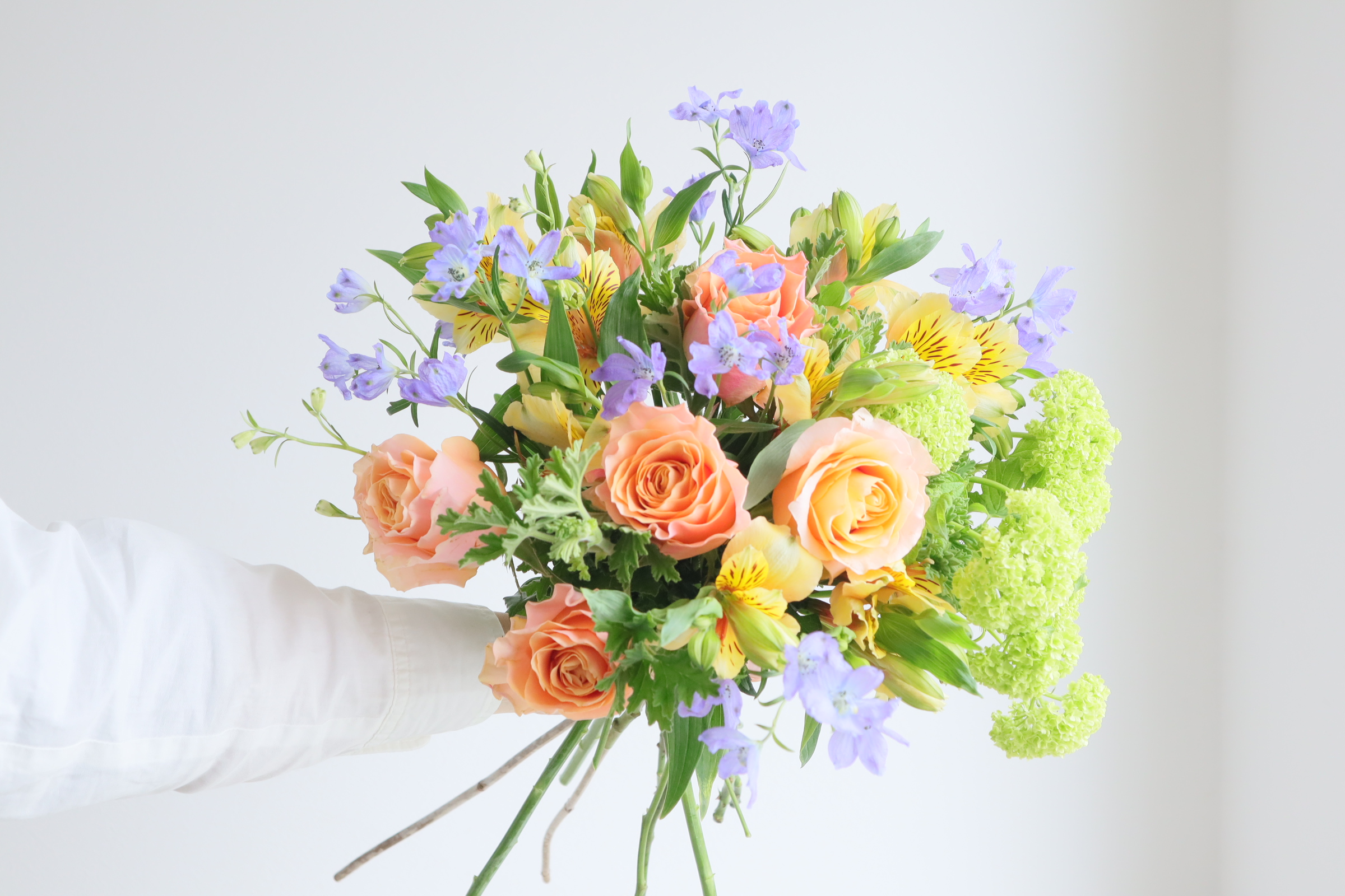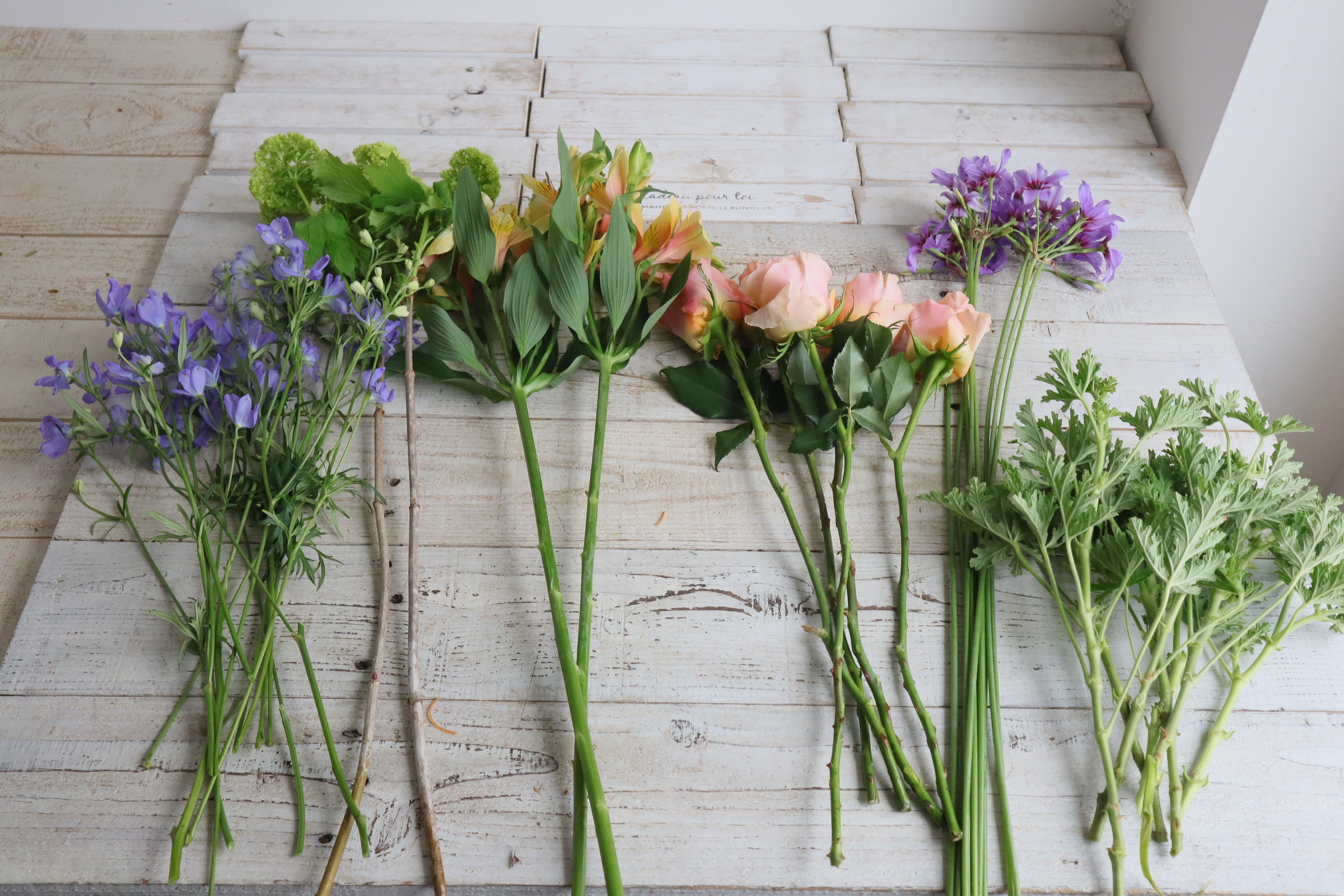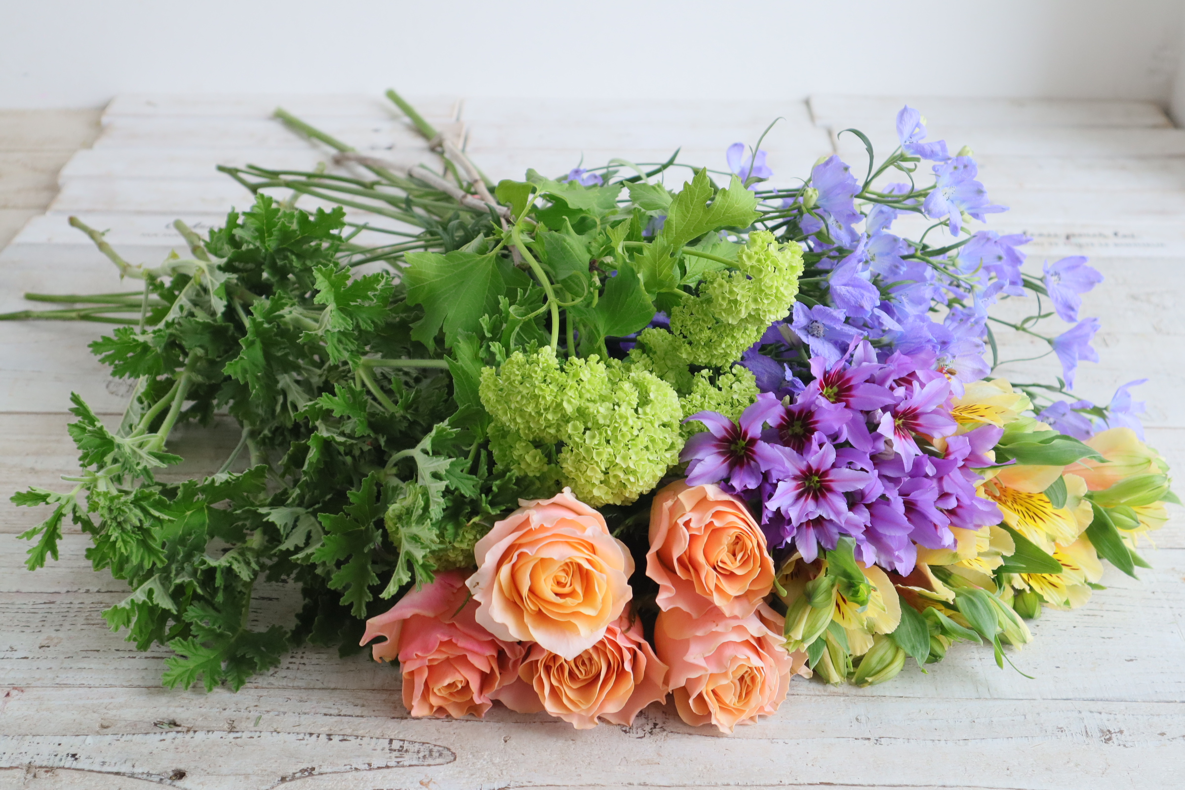 近藤先生「左から ローズゼラニウム、 バラのカルピデューム(オレンジ)、 グリーンのスノーボール、 紫のリューココリーネとデルフィニューム、 黄色のアルストロメリアです。」